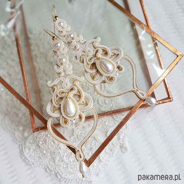 Wiktoria! Kolczyki ślubne sutasz - ecru, i złoto