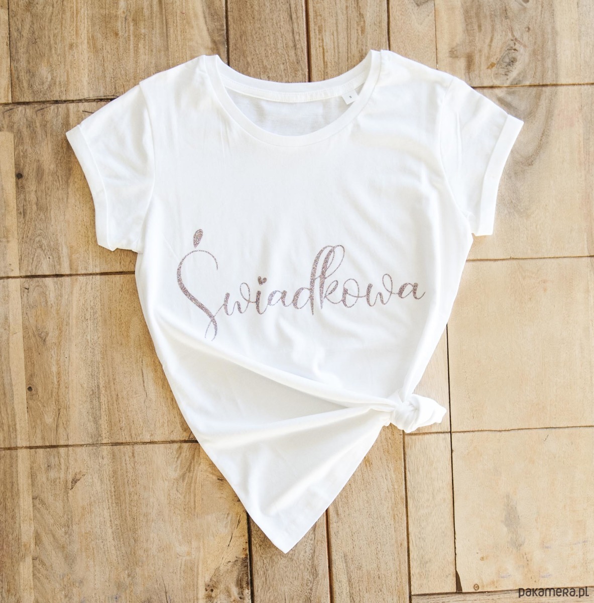 Fantastyczna koszulka w białym kolorze z brokatowym napisem Świadkowa. Kolor napisu do wyboru: złoty brokatowy, czarny brokatowy, różowy brokatowy, confetti brokatowy, srebrny brokatowy, czerwony brokatowy. Po zakupie poinformuj nas jaki kolor wybierasz.
