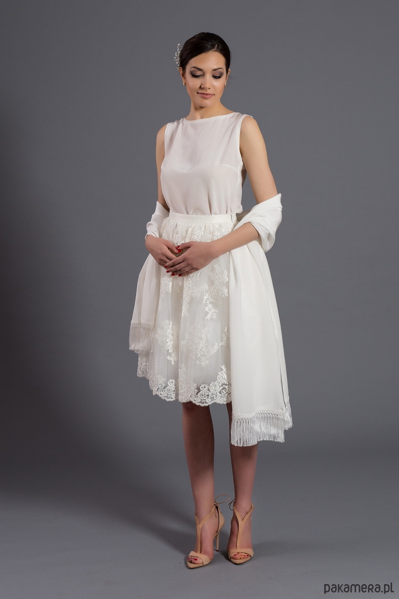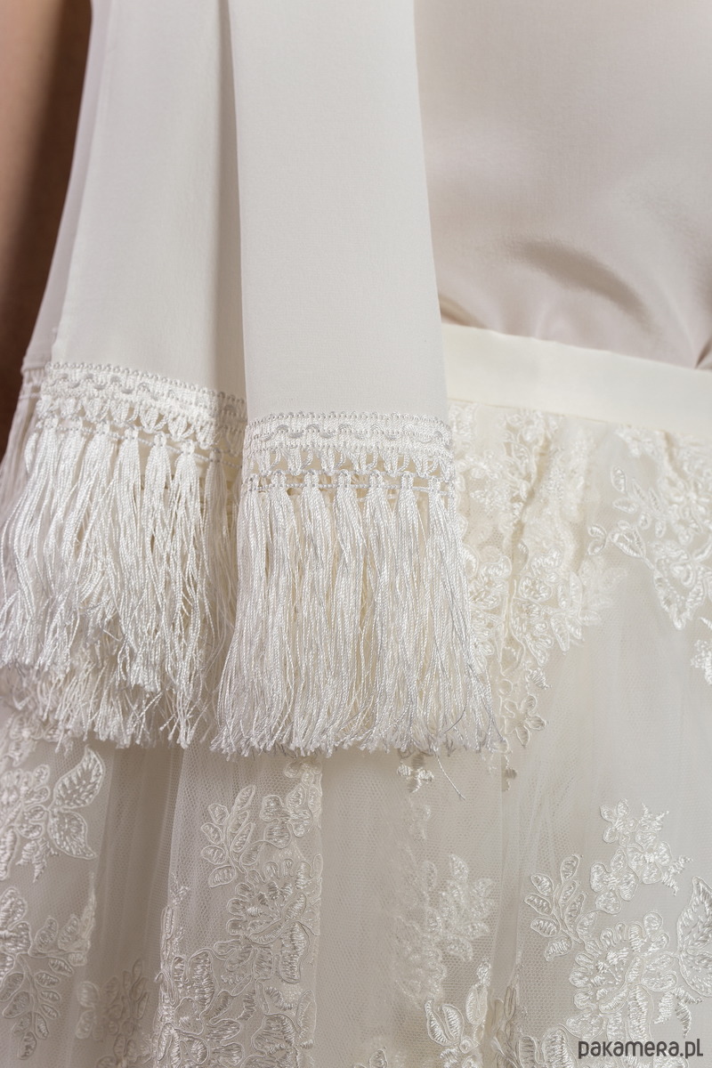 Szal w kolorze ecru, wykonany z krepy jedwabnej, wykończony ozdobnymi frędzlami. W ruchu prezentuje się wyjątkowo subtelnie i elegancko.
