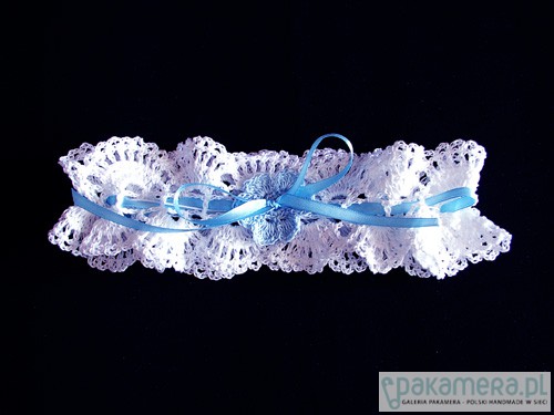 Podwiązka do ślubu wykonana na szydełku z kordonku w kolorze białym , ozdobiona szydełkowym kwiatkiem i niebieską wstążką . Rozmiar podwiązki (obwód) po rozciągnięciu 58 cm. Od spodu wciągnięta przezroczysta gumka, ukryta pod niebieską wstążeczką. Obwód można regulować zarówno gumką jak i wstążką.