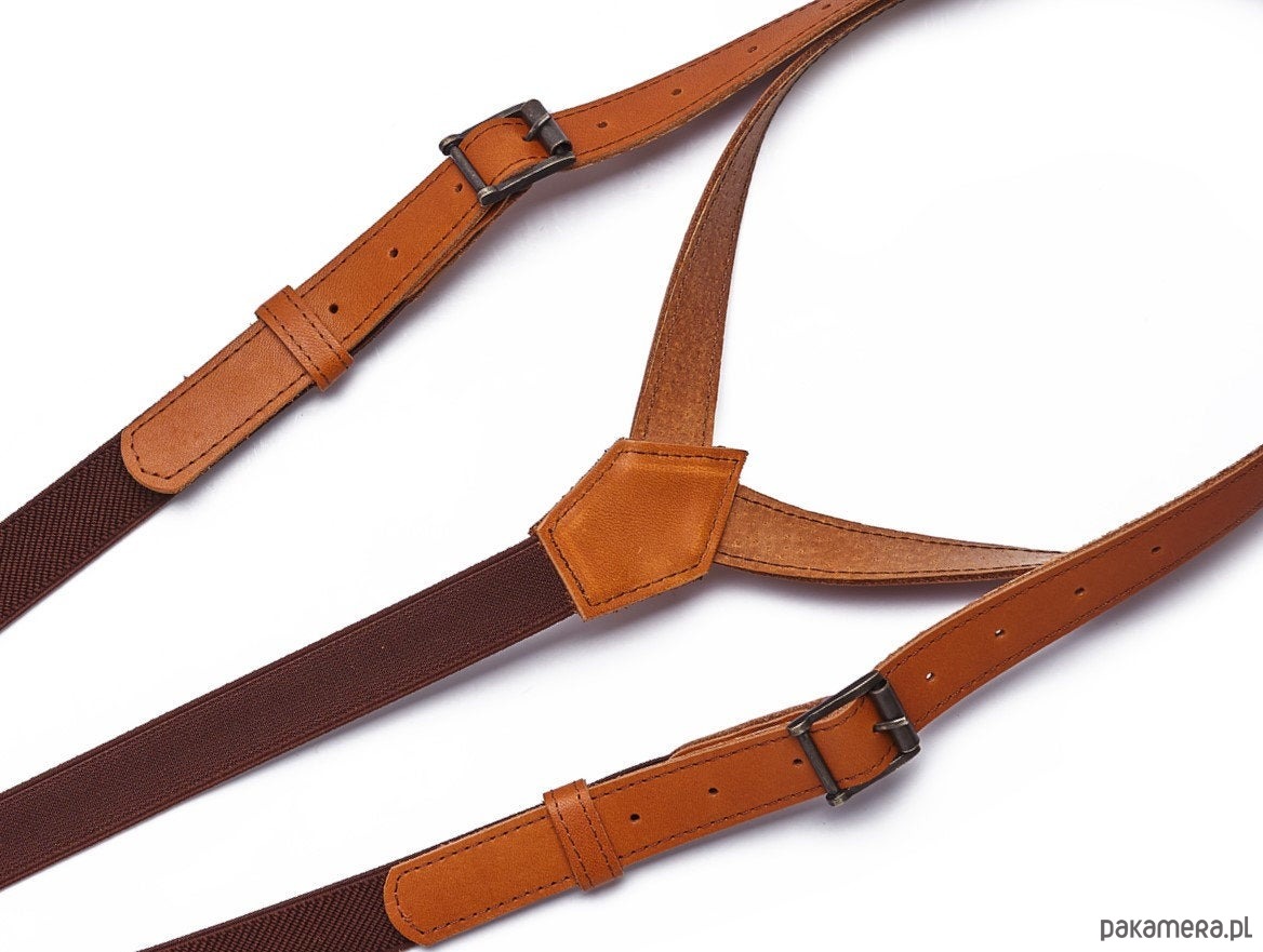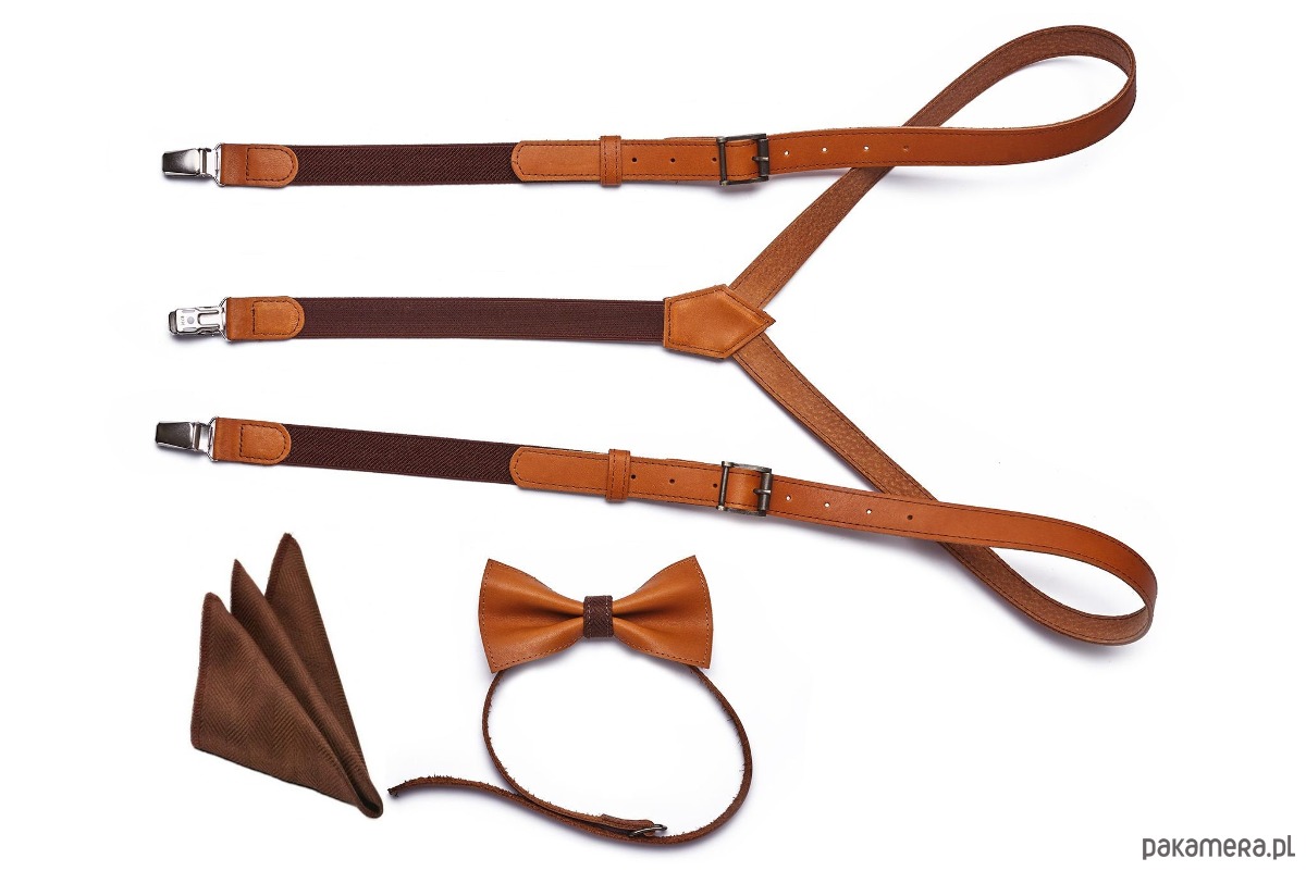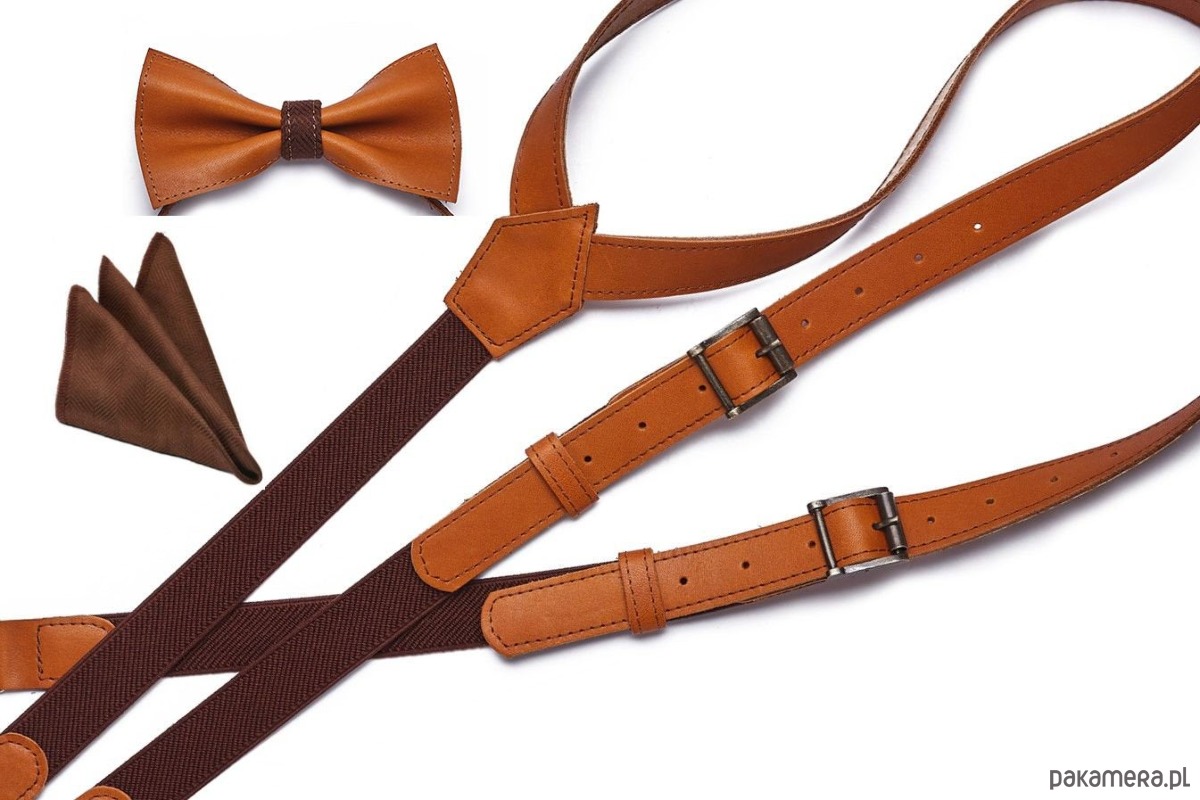 Brązowo-koniakowy zestaw szelki, mucha, poszetka