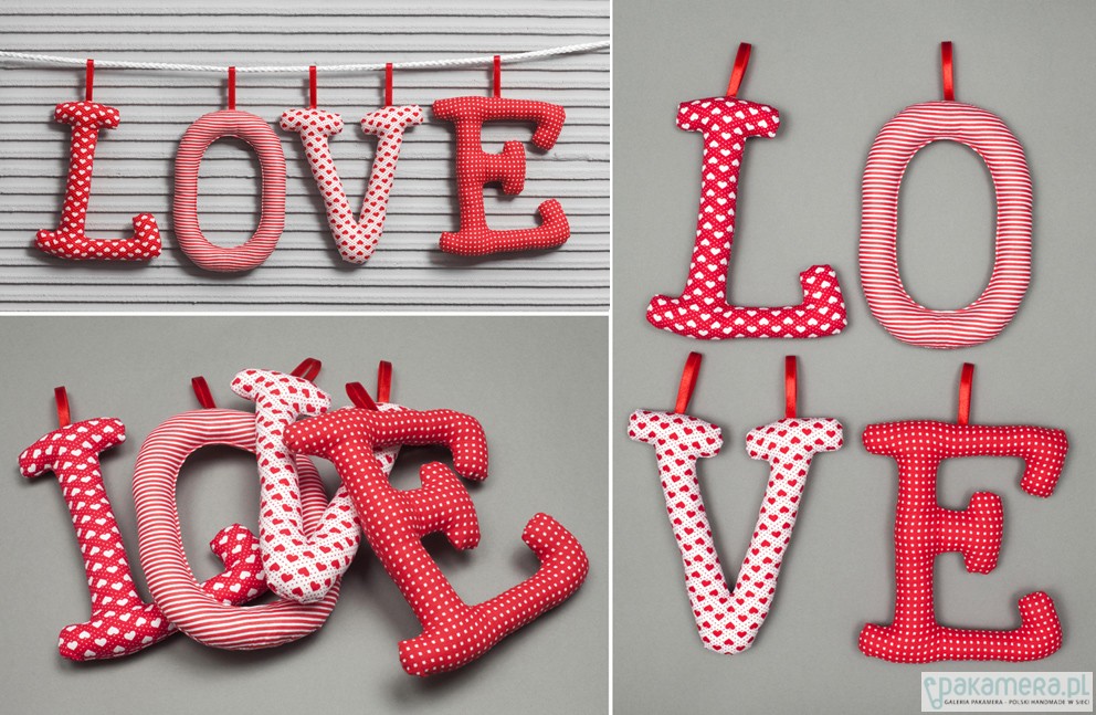 Bawełniane LOVE w kolorze czerwono-białym, każda literka uszyta z innego materiału z zastosowaniem antyalergicznego wypełnienia. Literowa girlanda pięknie ozdobi i ożywi każde wnętrze, wywoła uśmiech na twarzy obdarowanej osoby :) W skład zestawu wchodzą 4 litery - wysokość 17 cm i biały gruby sznurek - długość 170 cm.