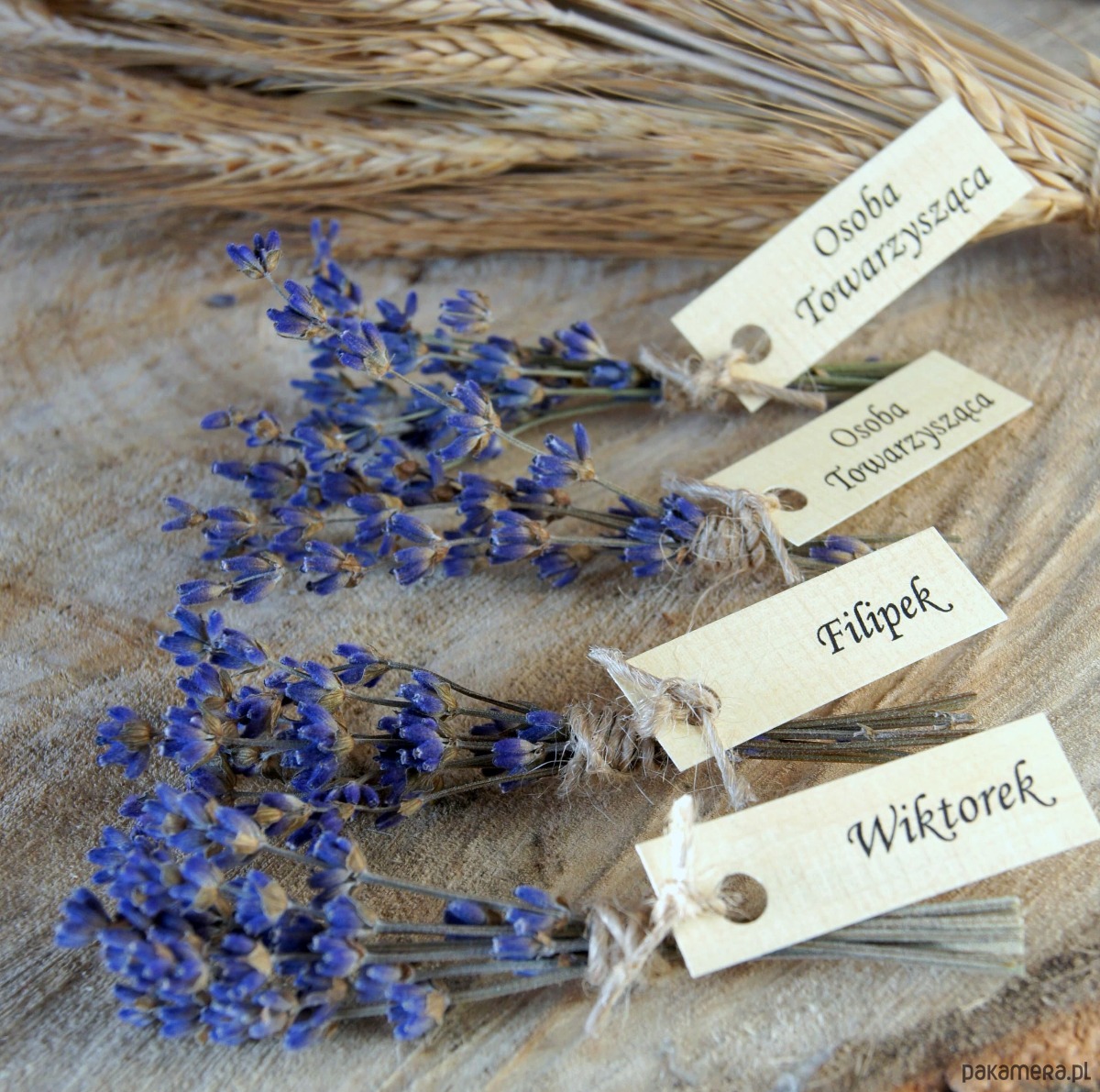 Zamówienie specjalne Zestaw - winietki imienne na stół z bukiecików naturalnej suszoną lawendy. Lawenda pochodzi z naszej ekologicznego Lawendowego Pola z Mazur, karteczki z imionami są ręcznie postarzane i przywiązane sznureczkiem. Bukieciki mają około 8 cm długości.
