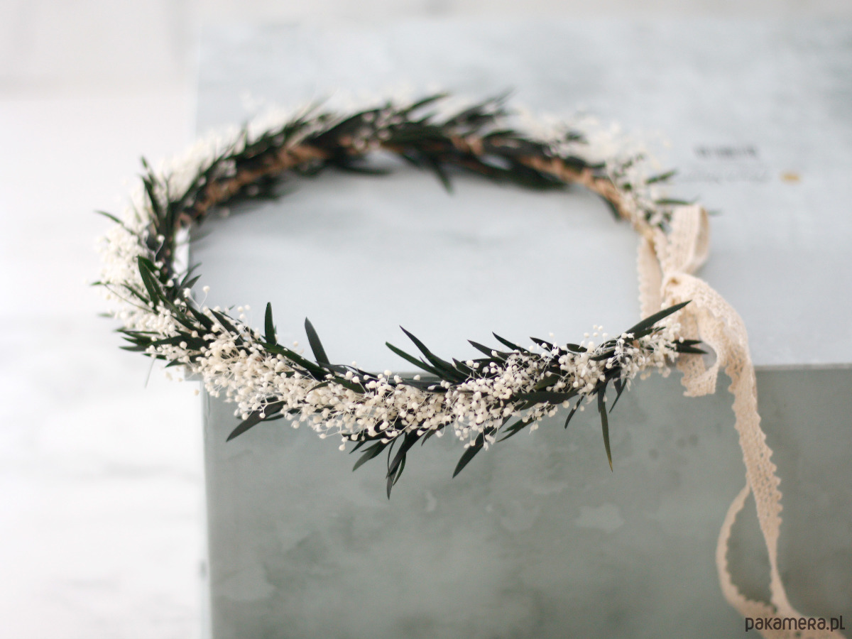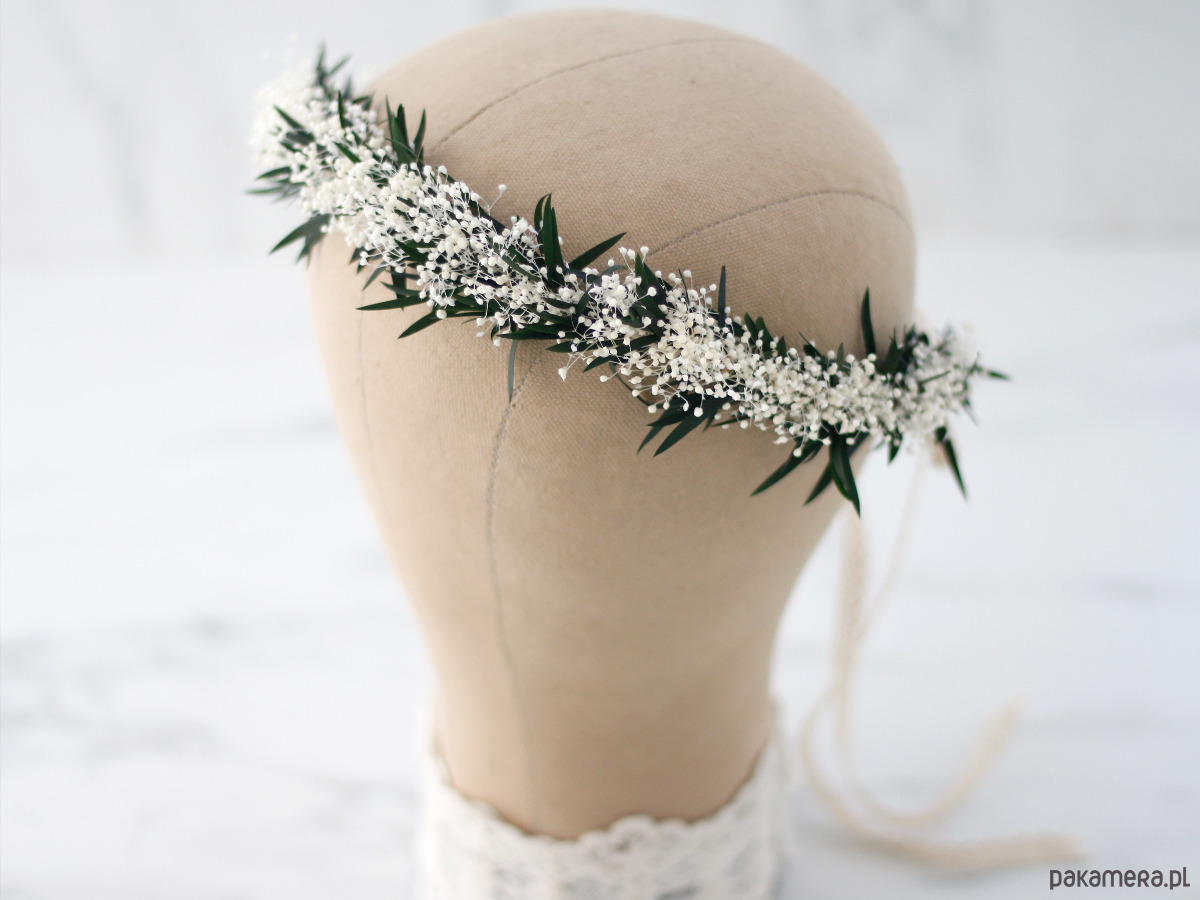 Uroczy wianek na głowę, wykonany w całości z naturalnych roślin - stabilizowanej gipsówki oraz listków. Część kwiatowa wianka ma 50cm, więc pasuje na każdą głowę o obwodzie powyżej 50cm. Będzie pasował zarówno na głowę dziecka, jak i osoby dorosłej. Możliwość regulacji wielkości obwodu, dzięki koronkowej tasiemce z tyłu. Kwiaty gipsówki oraz listki utrwalono w roztworze gliceryny i wody. Trwałość wianka ze stabilizowanych roślin wynosi od 6 miesięcy do kliku lat. Aby wianek długo zachował swoją świeżość, przestrzegaj kilku zasad: