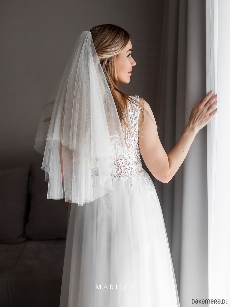 Klasyczny delikatny welon dwuwarstwowy opadający na ramiona. Welon ten jest delikatnie drapowany na grzebyku, co dodaje mu niesamowitej lekkości i delikatności. Zakończony gładko cięciem, dół zaokrąglony, klasyka gatunku jest idealny do romantycznych upięć, odpowiednio upięty pięknie otula ramiona delikatną mgiełką.