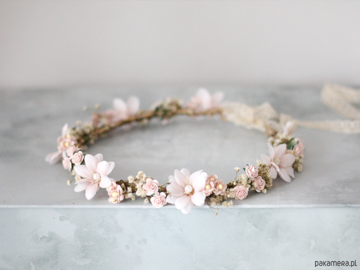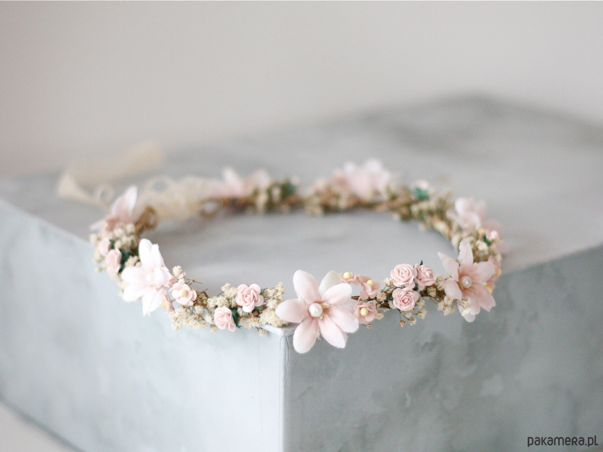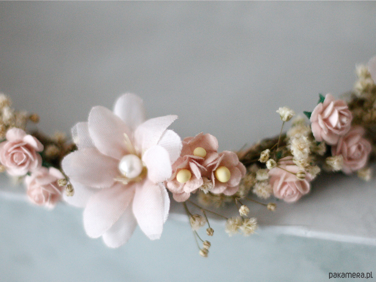 Uroczy wianek na głowę, wykonany z naturalnej, stabilizowanej gipsówki oraz materiałowych i papierowych kwiatów. Część kwiatowa wianka ma 50cm, więc pasuje na każdą głowę o obwodzie powyżej 50cm. Będzie pasował zarówno na głowę dziecka, jak i osoby dorosłej. Możliwość regulacji wielkości obwodu, dzięki koronkowej tasiemce z tyłu. Kwiaty gipsówki utrwalono w roztworze gliceryny i wody. Trwałość wianka ze stabilizowanej gipsówki wynosi od 6 miesięcy do kliku lat. Aby wianek długo zachował swoją świeżość, przestrzegaj kilku zasad: