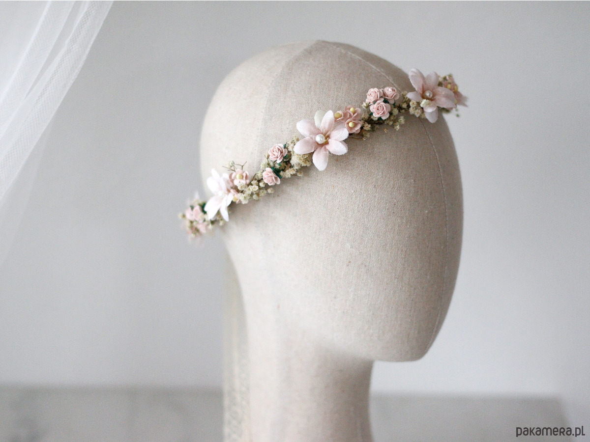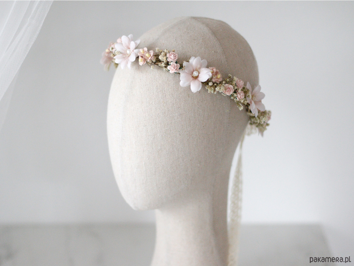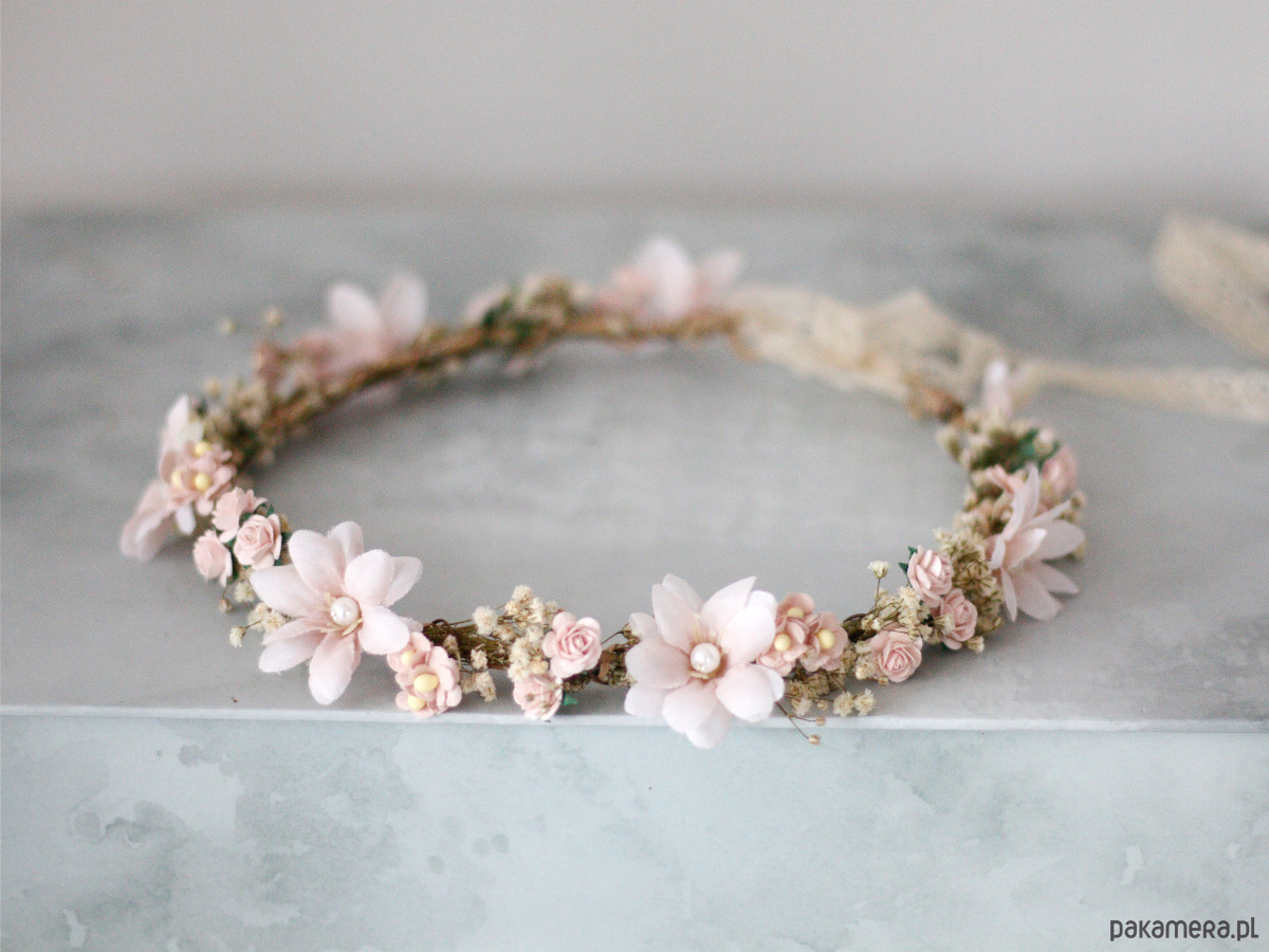 Uroczy wianek na głowę, wykonany z naturalnej, stabilizowanej gipsówki oraz materiałowych i papierowych kwiatów. Część kwiatowa wianka ma 50cm, więc pasuje na każdą głowę o obwodzie powyżej 50cm. Będzie pasował zarówno na głowę dziecka, jak i osoby dorosłej. Możliwość regulacji wielkości obwodu, dzięki koronkowej tasiemce z tyłu. Kwiaty gipsówki utrwalono w roztworze gliceryny i wody. Trwałość wianka ze stabilizowanej gipsówki wynosi od 6 miesięcy do kliku lat. Aby wianek długo zachował swoją świeżość, przestrzegaj kilku zasad: