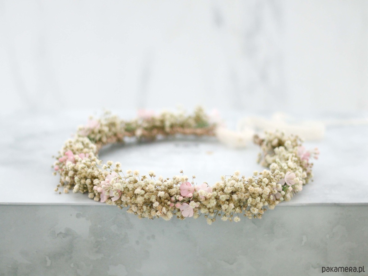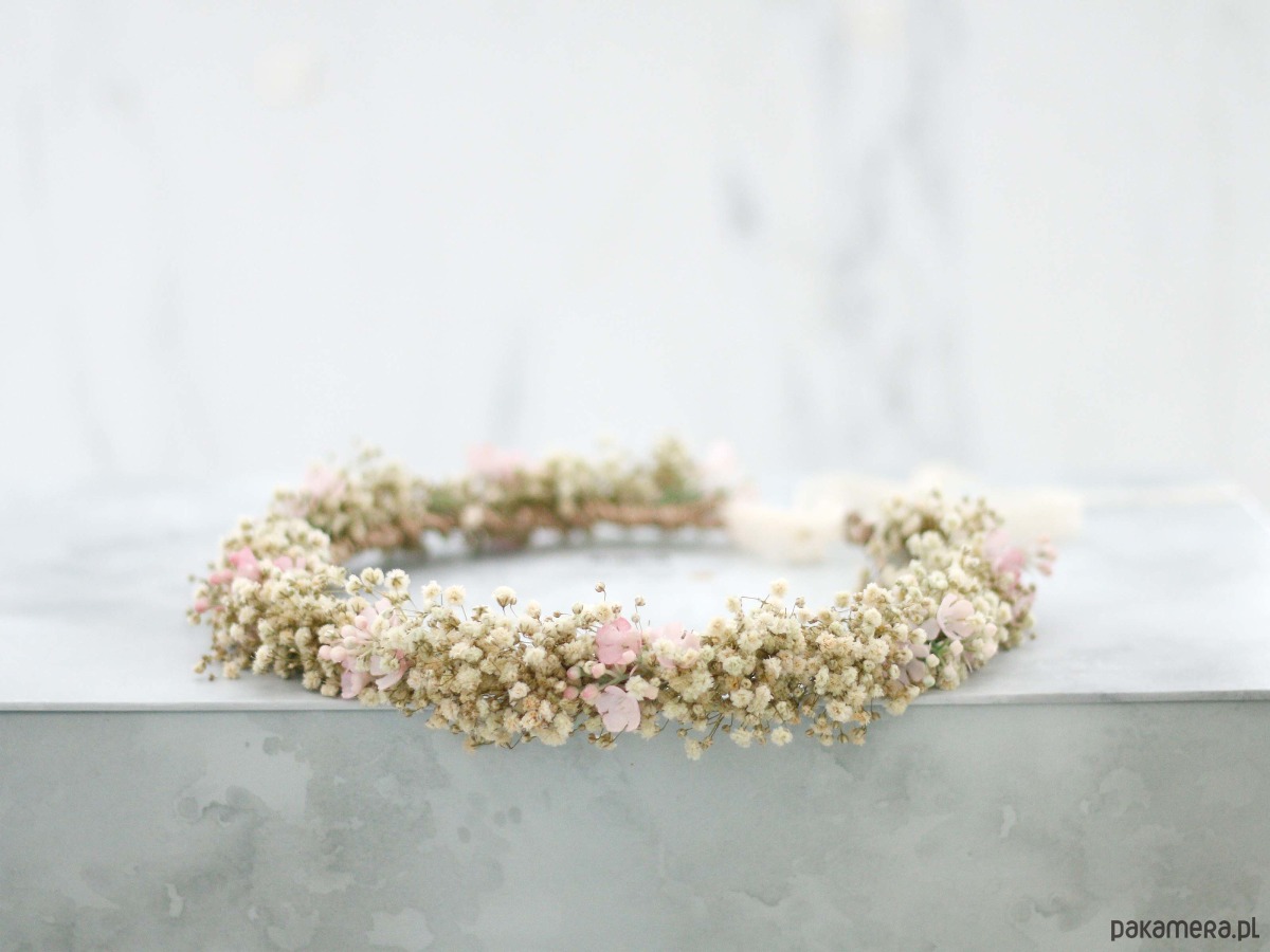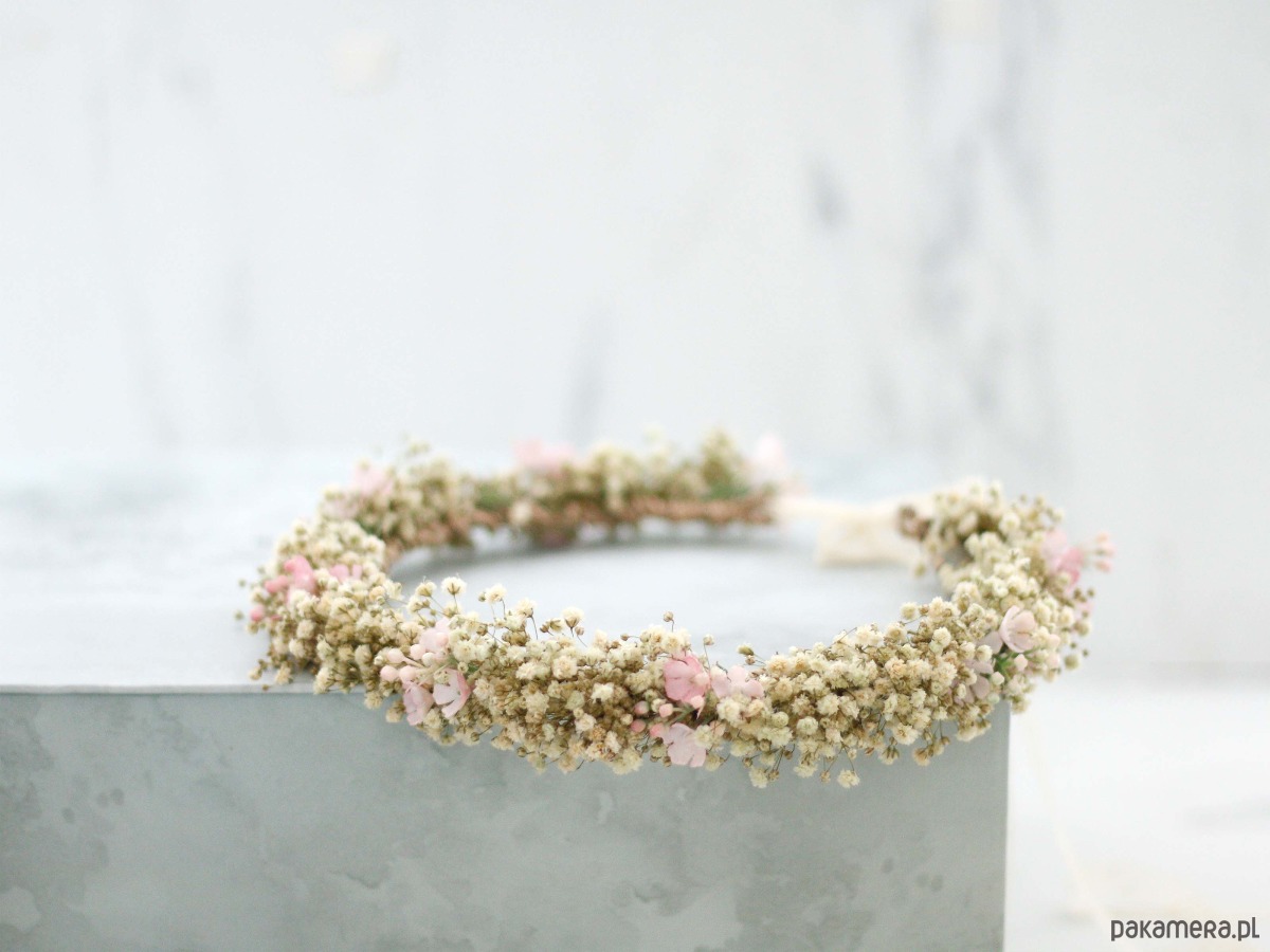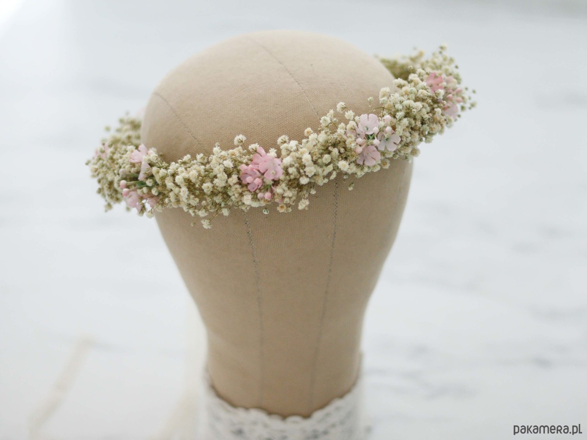 Uroczy wianek na głowę, wykonany z naturalnej, stabilizowanej gipsówki oraz niewielkich syntetycznych kwiatów w kolorze pudrowego różu. Część kwiatowa wianka ma 50cm, więc pasuje na każdą głowę o obwodzie powyżej 50cm. Będzie pasował zarówno na głowę dziecka, jak i osoby dorosłej. Możliwość regulacji wielkości obwodu, dzięki koronkowej tasiemce z tyłu. Kwiaty gipsówki utrwalono w roztworze gliceryny i wody. Trwałość wianka ze stabilizowanej gipsówki wynosi od 6 miesięcy do kliku lat. Aby wianek długo zachował swoją świeżość, przestrzegaj kilku zasad: