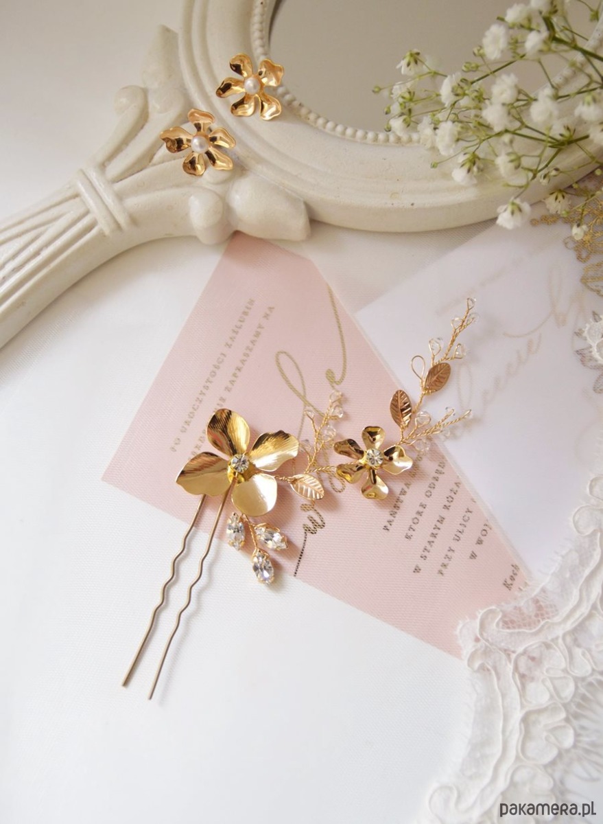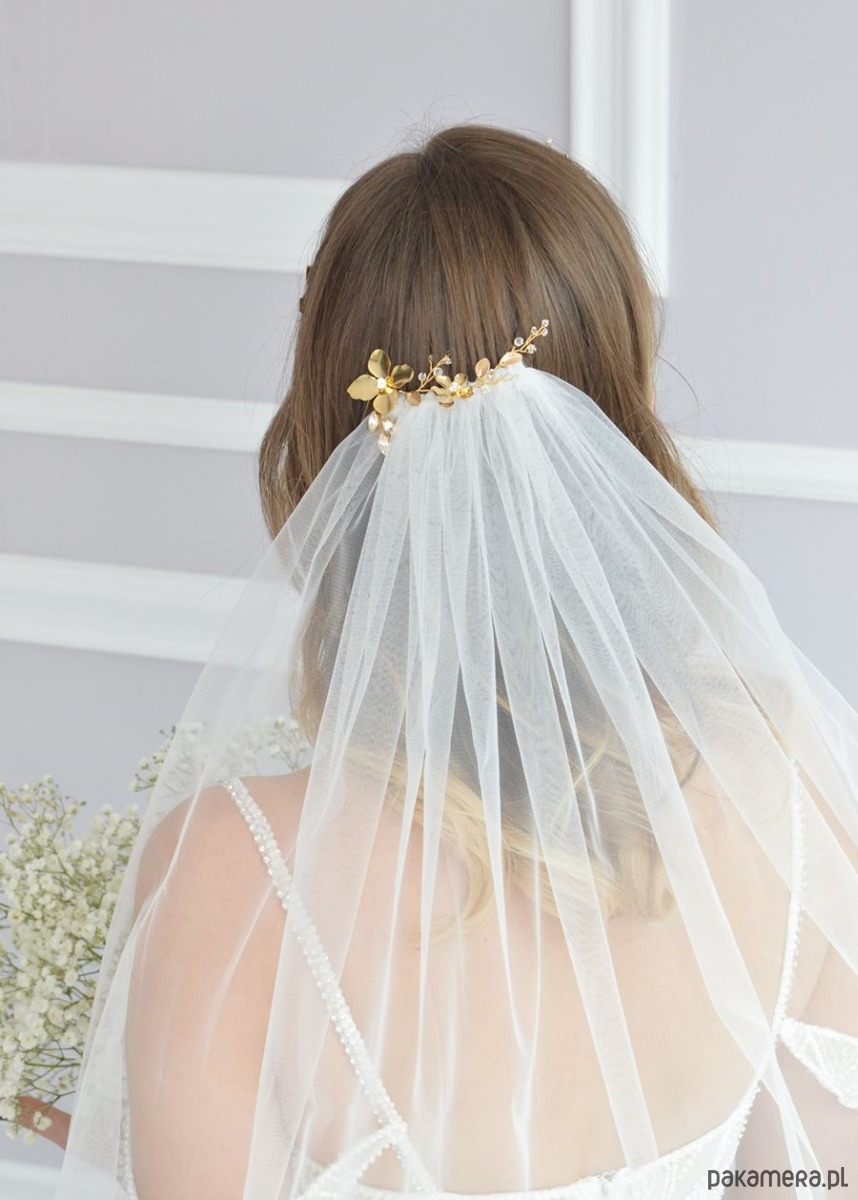 Złota gałązka do włosów wykonana z odpornego na matowienie drucika jubilerskiego, cyrkonii Preciosa w złotych oprawach, kryształków oraz pereł Swarovskiego w kolorze białym (odcień ciepły wpadający w ivory). Ozdoba bardzo lekka i plastyczna, o pięknym połysku. Dekorację wpina się we włosy za pomocą kokówek lub wsuwek (w komplecie), na życzenie ozdobę umieszczamy na złotym, metalowym grzebyku. Długość gałązki wynosi 11 cm.