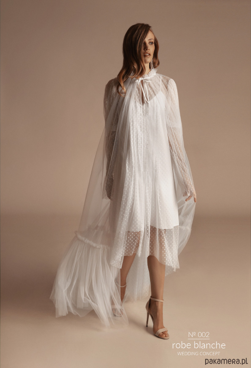 Klasa i minimalizm w nowoczesnym wydaniu. Efektowna peleryna wykonana z miękkiego tiulu z szeroką, ozdobną falbaną. Peleryna świetnie komponuje się z dowolną sukienką robe blanche, co potęguje jej uniwersalny charakter i możliwość spersonalizowania całości.