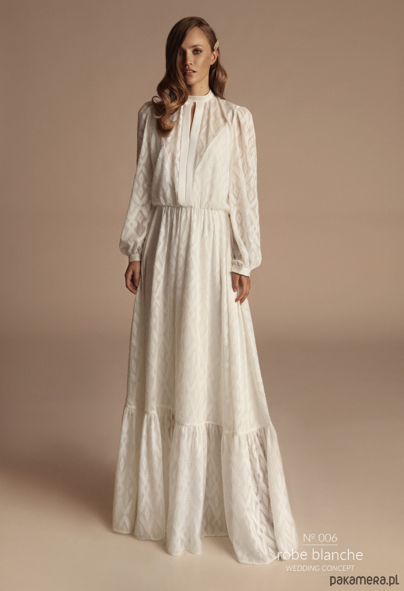 Długa suknia wykonana z wzorzystej tkaniny wysokiej jakości o wyjątkowo pięknym odcieniu złamanej bieli. Lekkie drapowanie na ramionach, bufiasty efekt rękawa wraz z dekoltem na stójce tworzą niezwykle elegancki efekt. Wysoka talia podkreślona marszczeniem wraz z szeroką falbaną u dołu profiluje sylwetkę i optycznie ją wydłuża. Suknia zestawiona z długą peleryną robe blanche tworzy spektakularny i bardzo oryginalny efekt .
