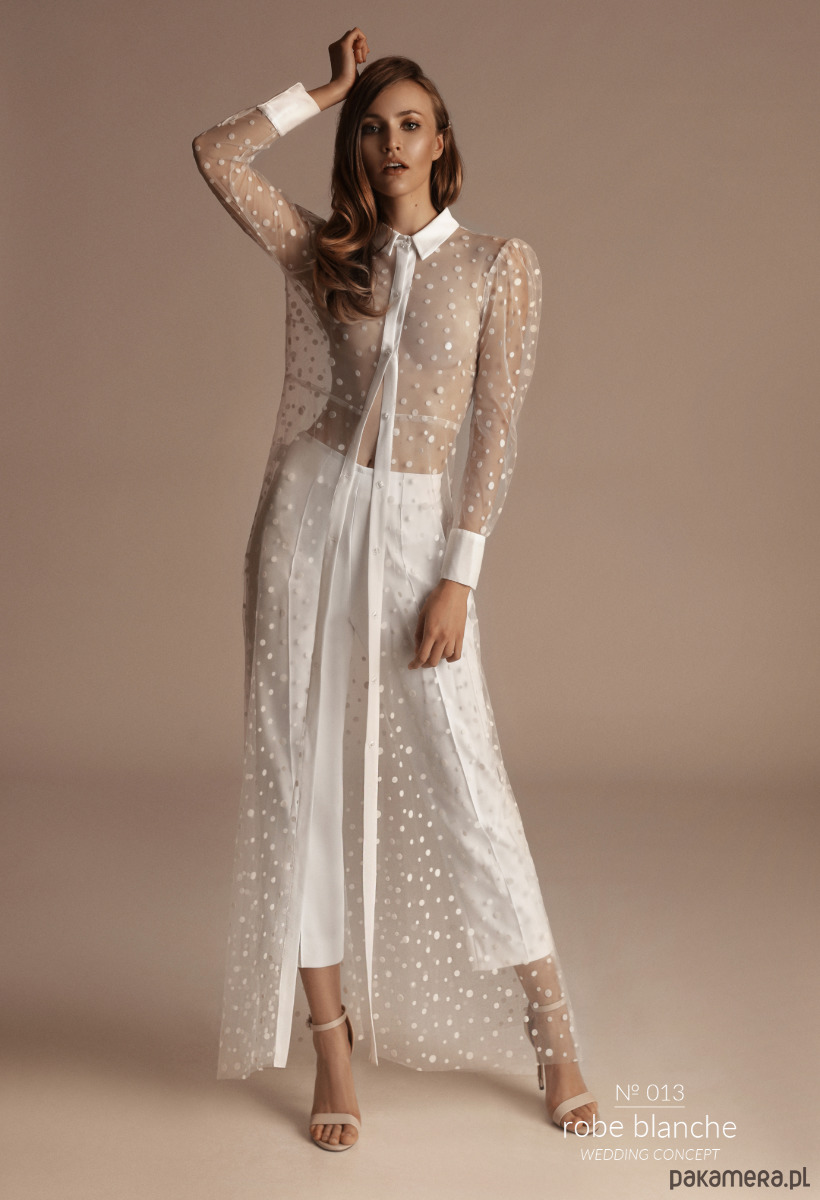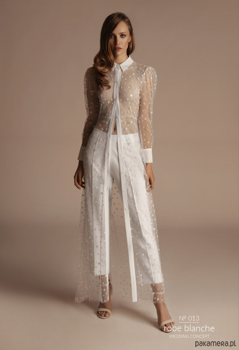 Kompozycja sukienki wykonanej z lekko elastycznego tiulu w haftowane kropki w połączeniu z eleganckimi spodniami z białej krepy tworzy nowoczesny i intrygujący efekt. Ozdobą sukienki jest charakterystyczny kołnierzyk i biżuteryjne zapięcia, całość przyciąga uwagę i zapada w pamięć. Sukienka również spektakularnie prezentuje się w wersji z atłasową halką .