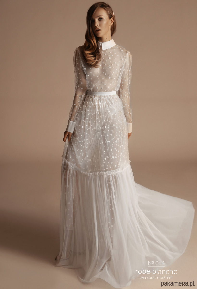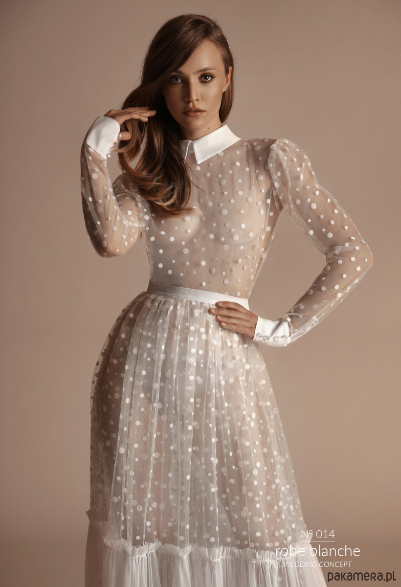 Suknia wykonana z lekko elastycznego tiulu o haftowanym wzorze. Całość jest niezwykle oryginalna i nietuzinkowa. Ozdobą sukni jest charakterystyczny kołnierzyk i szerokie mankiety z biżuteryjnym zapięciem, co w połączeniu z szeroką falbaną u dołu tworzy spektakularny efekt. Zaakcentowana linia talii wraz z lekkim drapowaniem ramion profiluje sylwetkę optycznie ją wysmuklając. W celu zniwelowania transparentność suknie można wykonać na podszewce z cielistej bądź białej tkaniny. Świetnie prezentuje się również z elegancką bieliźnianą halką.