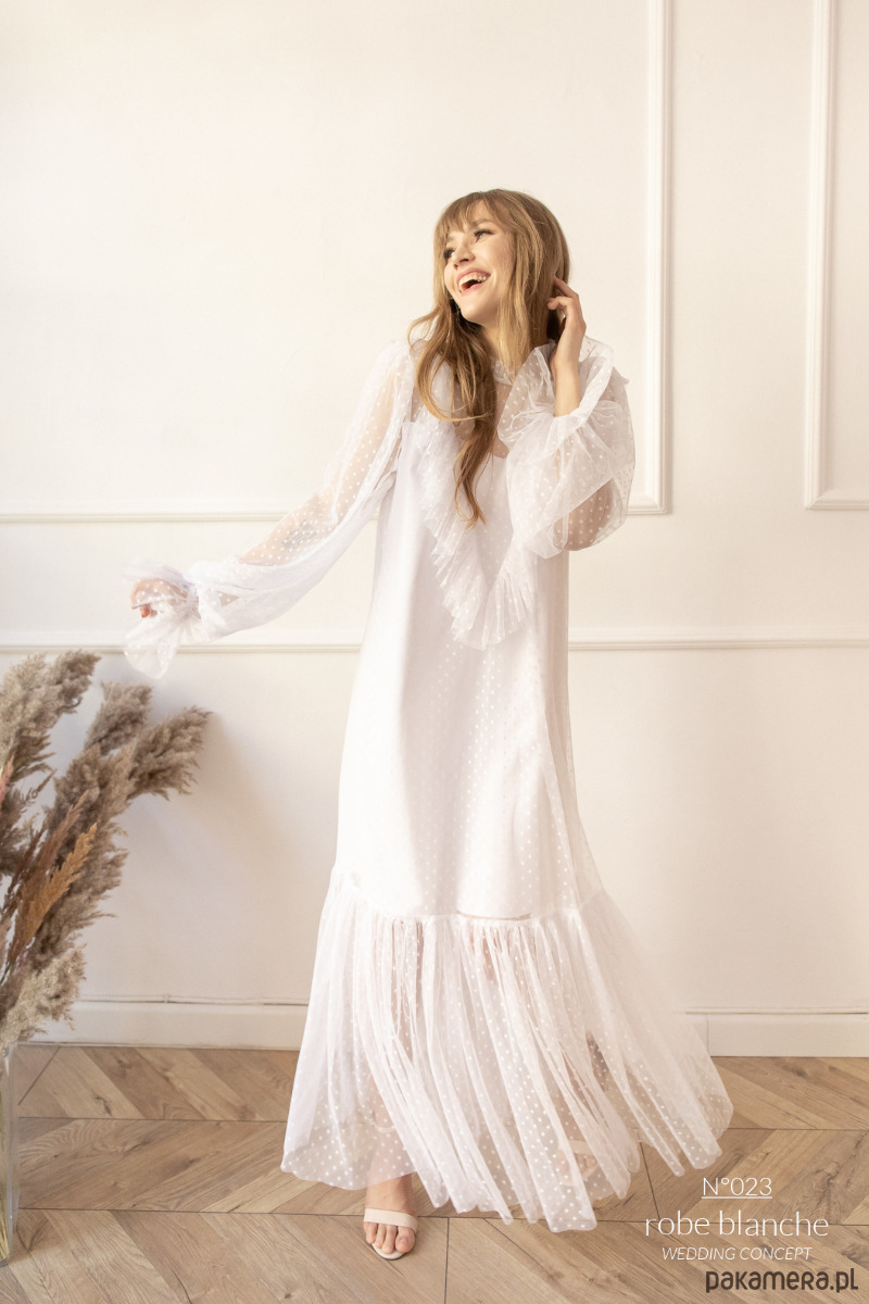 Niezwykle efektowna sukienka o luźnym fasonie, wykonana z miękkiego tiulu o subtelnym wzorze. Ozdobą sukienki jest charakterystyczna szeroka falbana z przodu i z tyłu sukienki w kształcie litery V i bufiasty długi rękaw. Dół sukienki zakończony jest szeroką marszczoną falbaną nadając całości bardzo oryginalny i subtelny charakter.