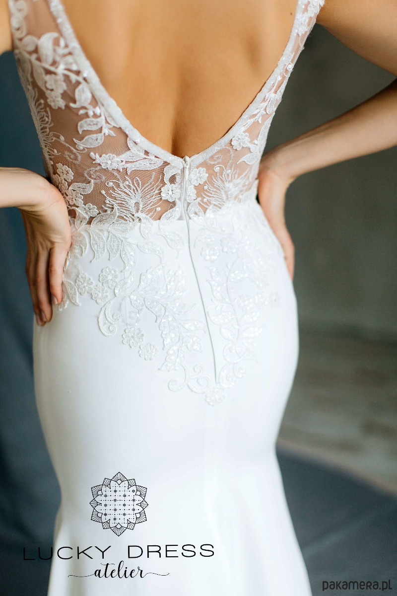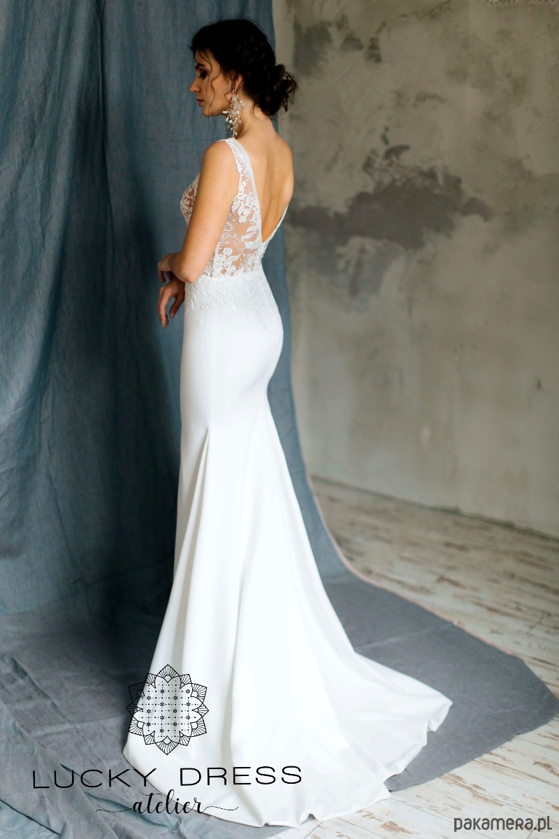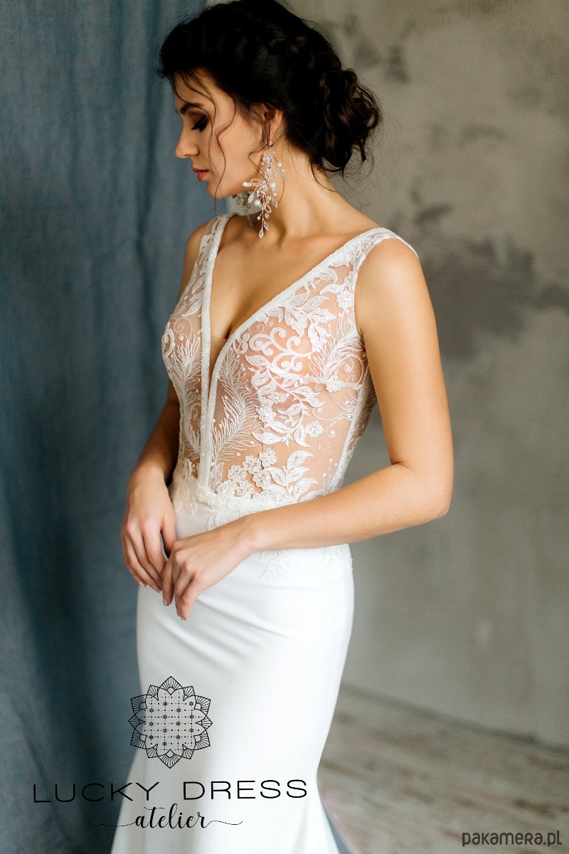 Era to suknia ślubna o dopasowanym kroju trąbki utrzymana w kolorze złamanej bieli. Górę sukni ślubnej uszyłyśmy z koronki z motywem strusich piór oraz koronkowych aplikacji ozdobionych koralikami i cekinami. Góra sukni ślubnej w pióra posiada bardzo głęboki dekolt V, który ozdobiłyśmy paseczkiem błyszczących koralików, z tyłu suknia posiada gołe plecy również o kształcie litery V. Dół sukni ślubnej natomiast uszyłyśmy ze ślubnej krepy, z tyłu suknia przechodzi w podpinany tren. Całość sprawia, że będziesz wyglądać w niej niezwykle kusząco. Odpowiednio dobrane dodatki nadadzą Ci klasy i stylu! Będziesz niczym Daisy dla swojego Jay’a.