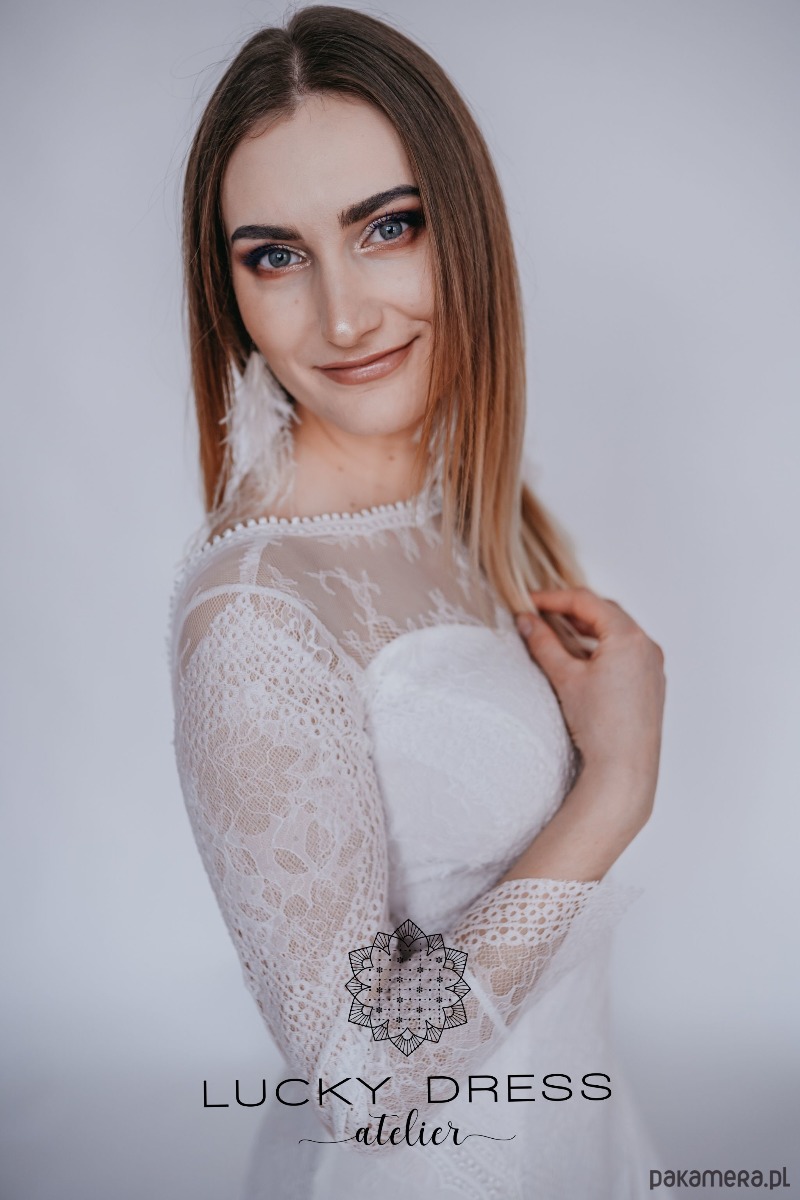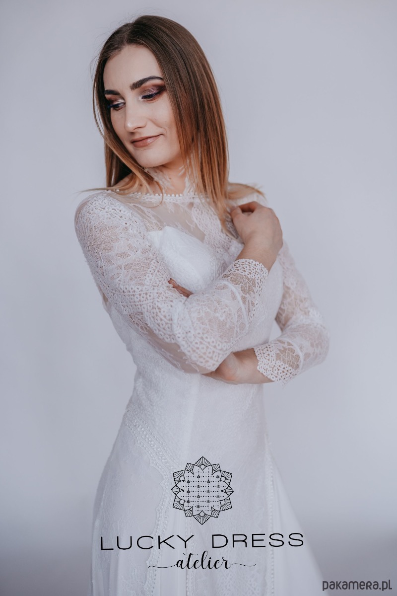 Halina to suknia ślubna, która powstała na podstawie inspiracji znanego modelu. My szyjemy ją ręcznie na miarę w naszym AtelierLuckyDress. Ta suknia ślubna gypsy o dopasowanej górze i zwiewnym dole jest utrzymana w kolorze ivory. Tę zimową suknię ślubną szyjemy z połączenia wiskozowej podszewki w kolorze ivory, zjawiskowej bawełnianej koronki z geometrycznym wzorem w którym został zamknięty motyw kwiatów i liści oraz delikatnej francuskiej koronki chantilly. Przód tej sukni ślubnej układa się w dekolt typu łódka, natomiast plecy są praktycznie gołe co nadaje całej kreacji zmysłowości. Suknia ślubna posiada długie rękawy, które kończą się nad nadgarstkiem oraz zjawiskowy i długi tren, który wydłuża sylwetkę.