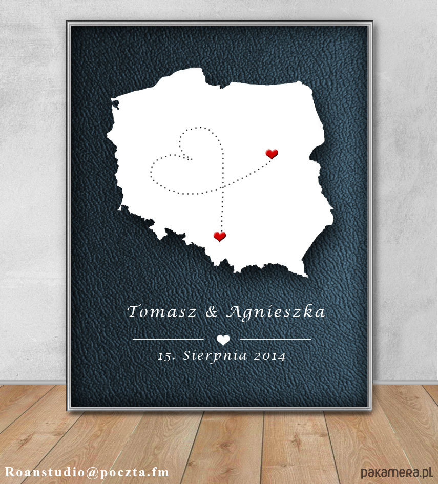 Stylowa i oryginalna pamiątka dla Młodej Pary pochodzącej z dwóch różnych miast. Zawiera datę ślubu oraz imiona nowożeńców :)Serduszka znajdują się w miejscach z których pochodzą małżonkowie
