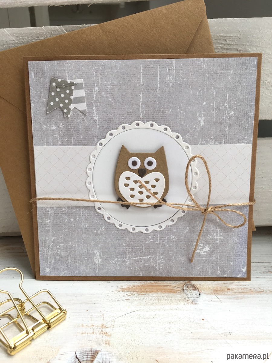 Kartka z sówką. Brązowa baza aza w rozmiarze 13,5x13,5cm. W zestawie koperta.
