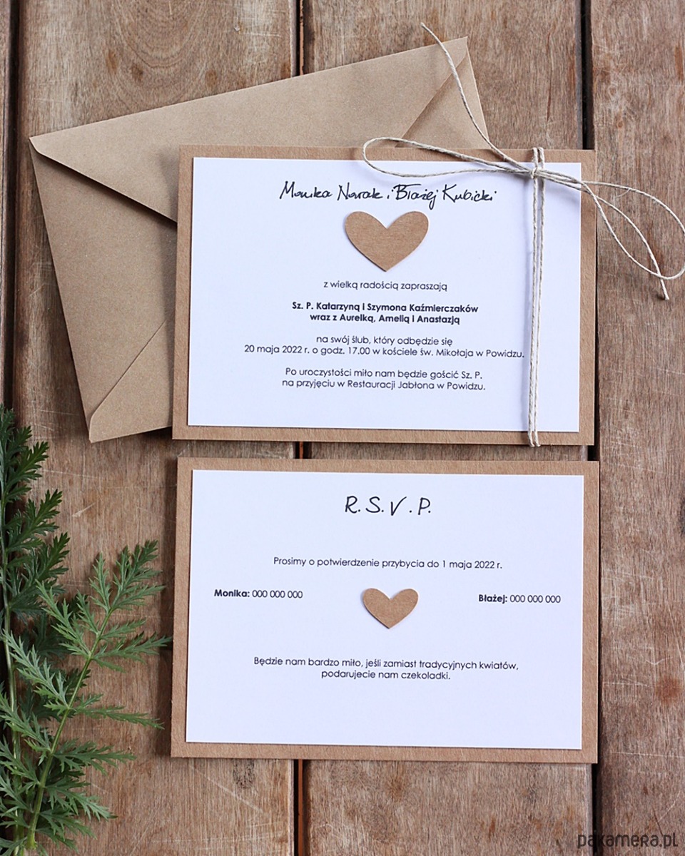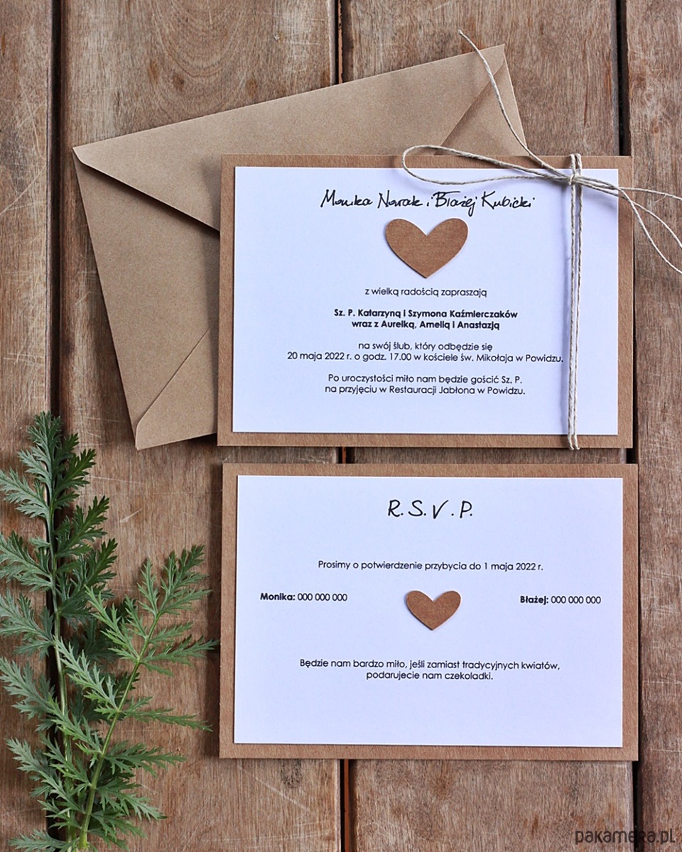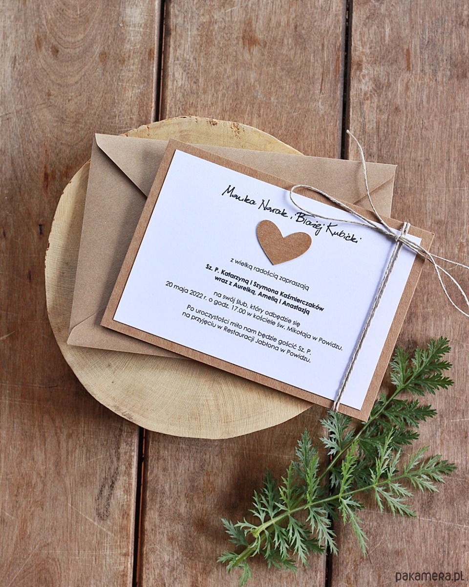Jednostronicowe zaproszenia ślubne w stylu rustykalnym.