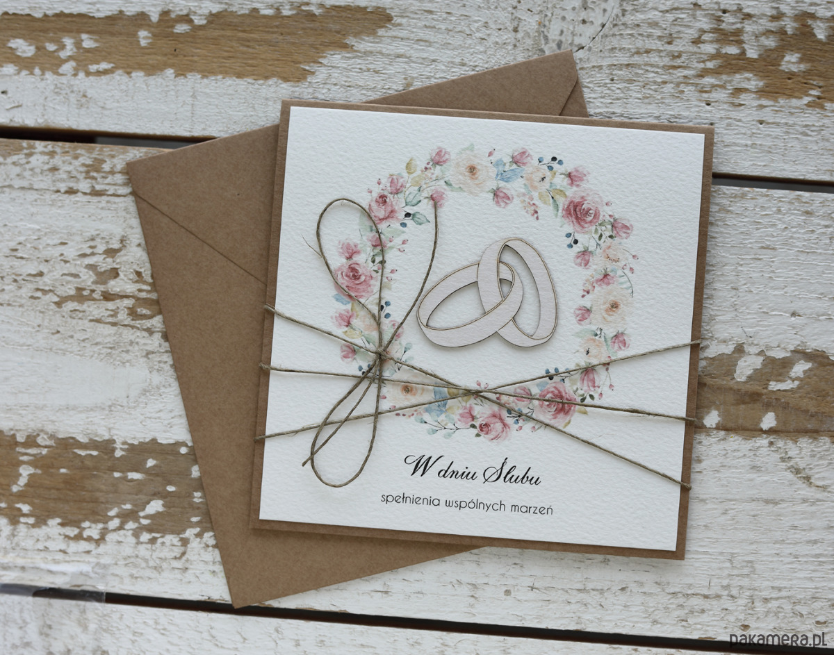 Oryginalna kartka na ślub. Kartka 14x14 wraz z kopertą. Kartka wykonana z papieru kraftowego, papieru bawełnianego oraz tekturki. Gotowe życzenia są nadrukowane w środku kartki. Brak możliwości zmiany.
