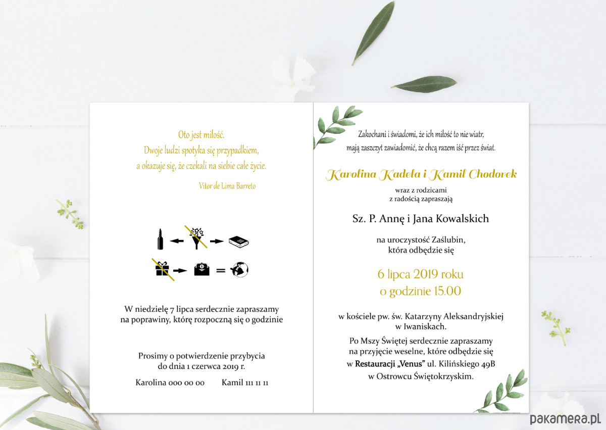 Zaproszenie "Kartka z kalendarza" z motywem złotej ramki i ręcznie malowanych zielonych listków.