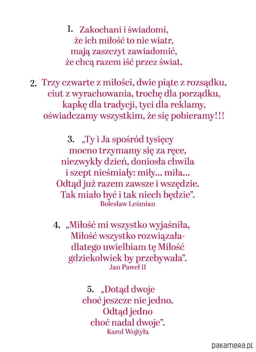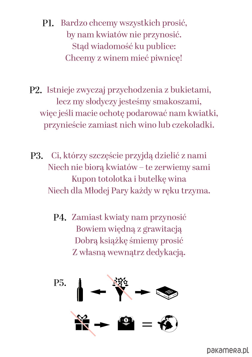 - numer wiersza i numer wzoru o prezentach (można wysłać również swój własny tekst lub wiersz, który chcą Państwo umieścić w zaproszeniu).