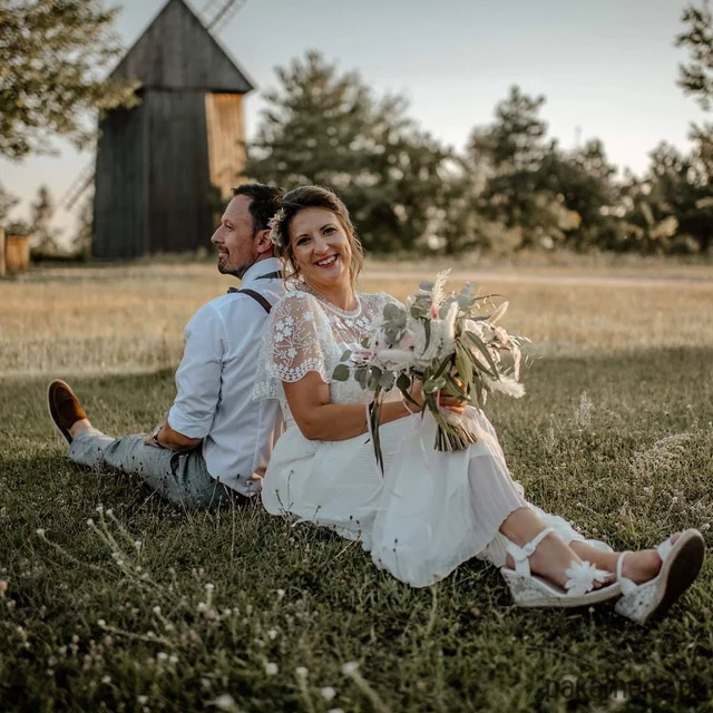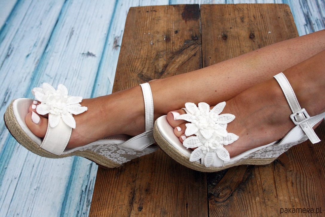 Te buty ślubne na koturnie, ozdobione gipiurowymi koronkowymi kwiatami są idealnym dodatkiem do romantycznego ślubu w stylu Boho.