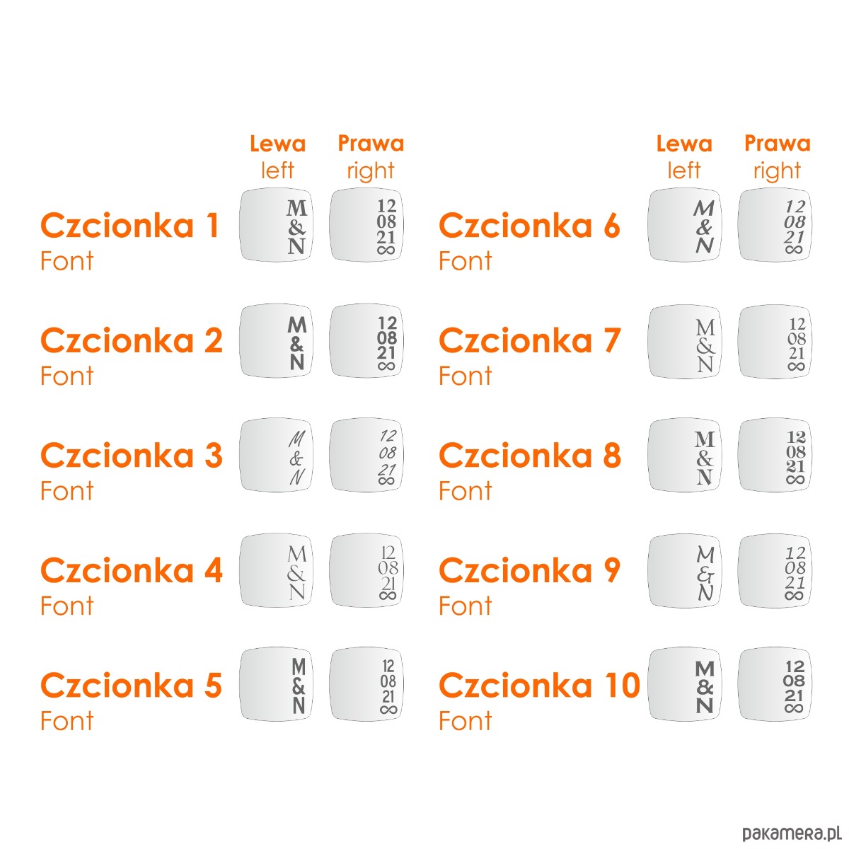 W informacji do sprzedającego wpisz numer czcionki oraz inicjały i datę na Lewej i Prawej spince. Grawer może być inny na L i P spince.