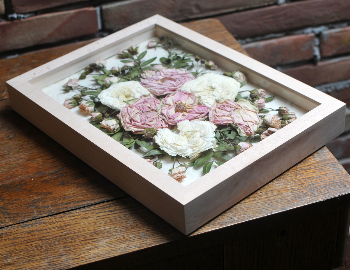 Rama jest z litego drewna, z przodu rośliny będzie chronić wysokiej jakości pleksi. Efekt jest przestrzenny, bardzo interesujący. Wspaniała pamiątka na lata!