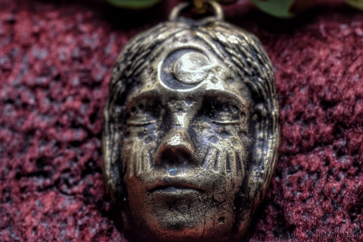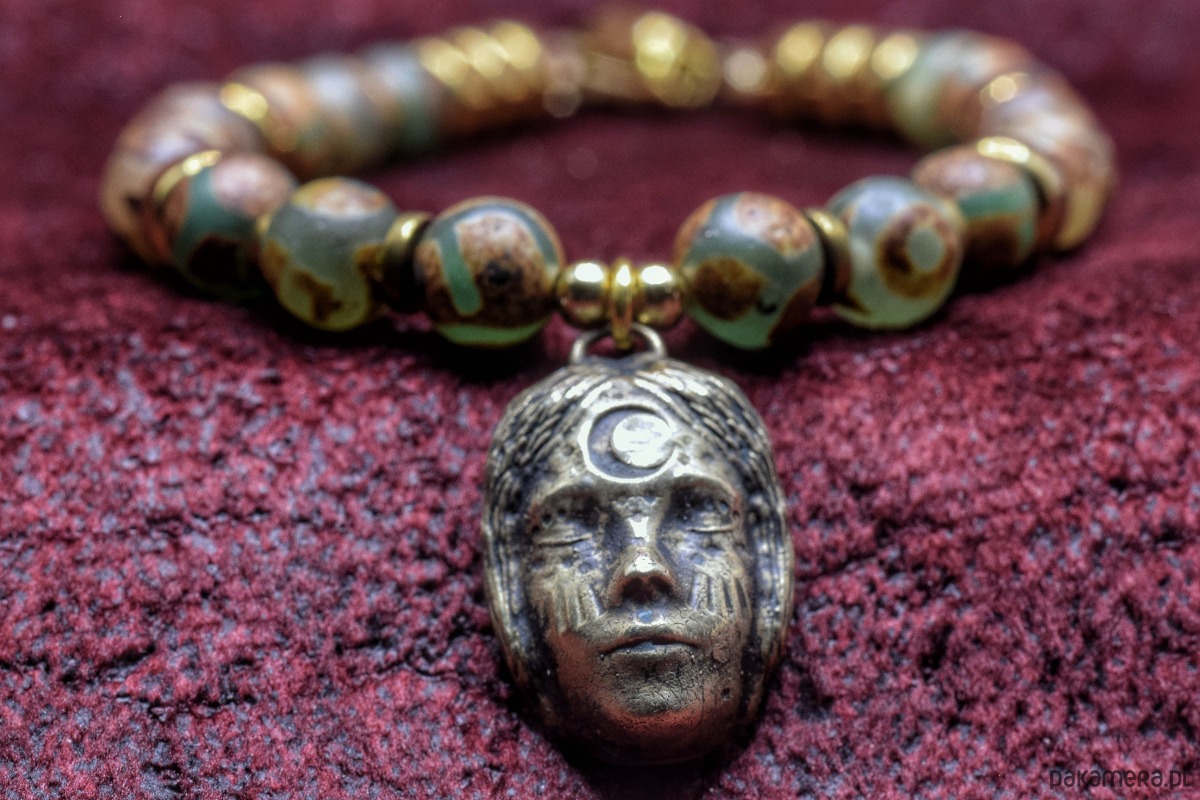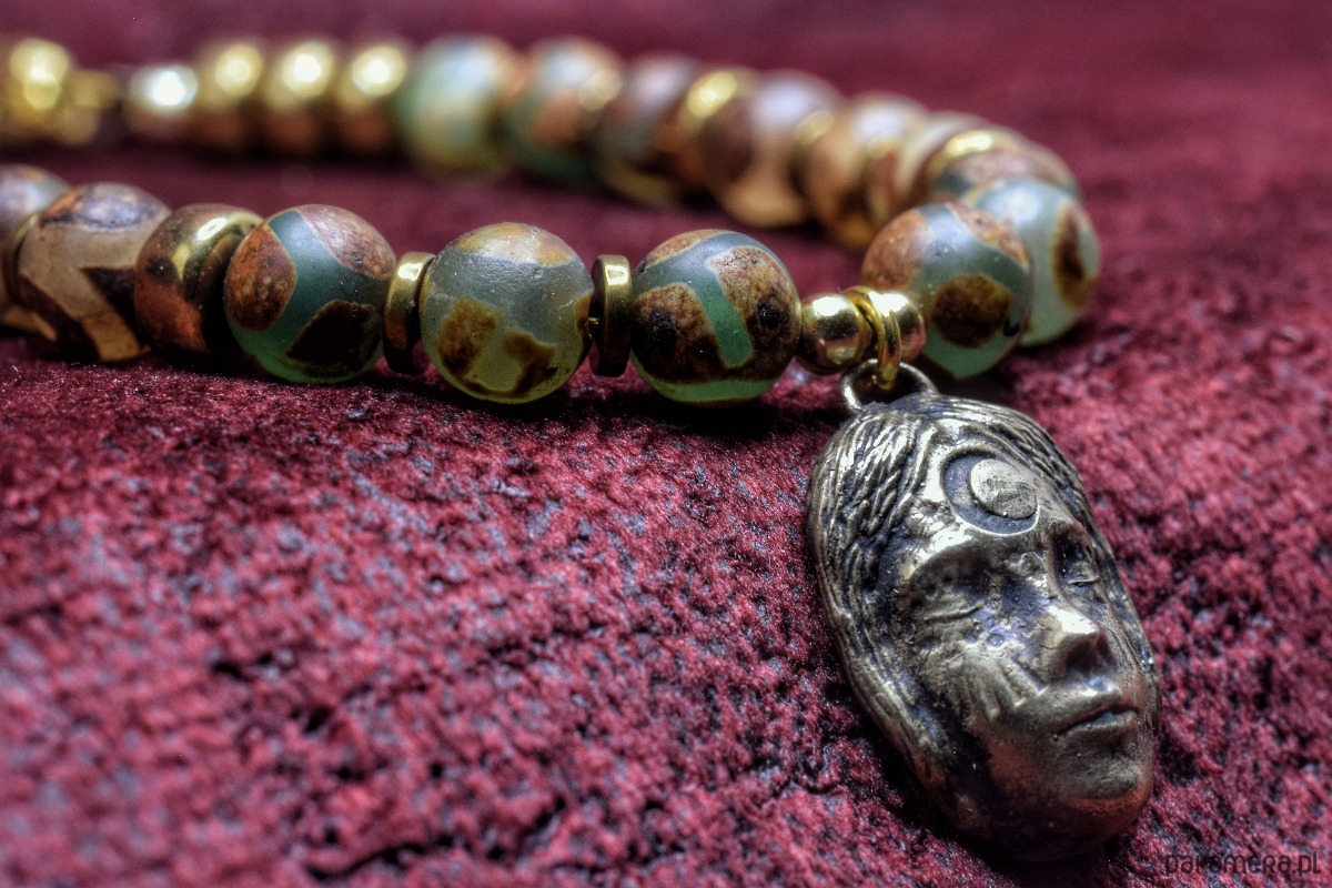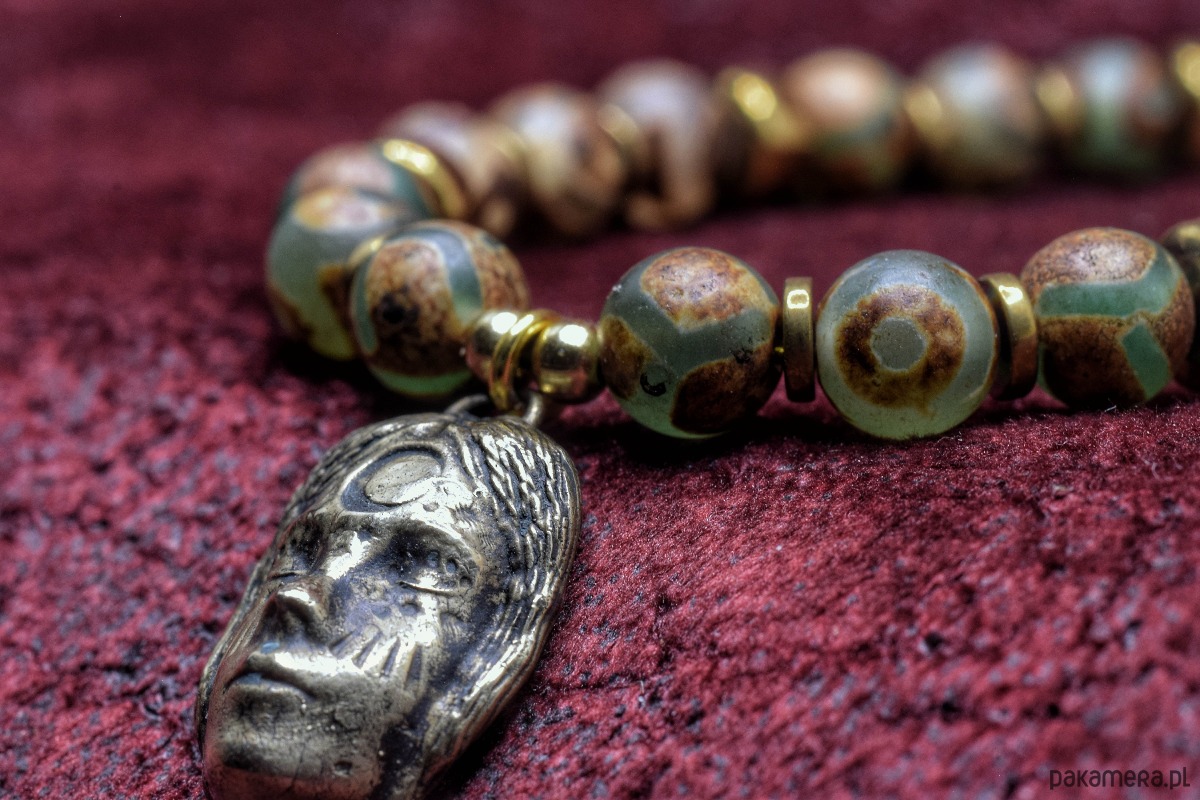 Bransoletka złożona z agatu tybetańskiego z wisiorkiem z projektu "Słuchanie nocy" odlanym w brązie.