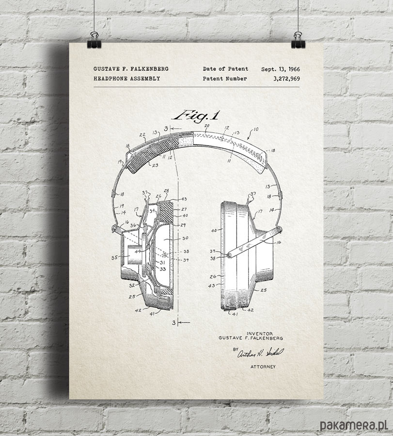 Plakat z reprodukcją patentu na konstrukcję słuchawek, autorstwa Gustave F. Falkenberga. Patent o numerze 3,272,969 został udzielony w 1966 roku przez Urząd Patentów i Znaków Towarowych Stanów Zjednoczonych.