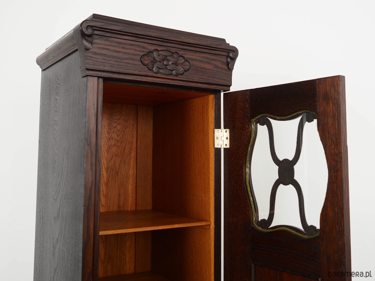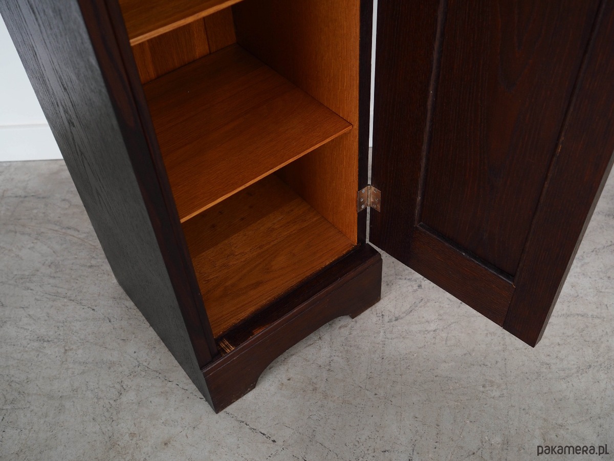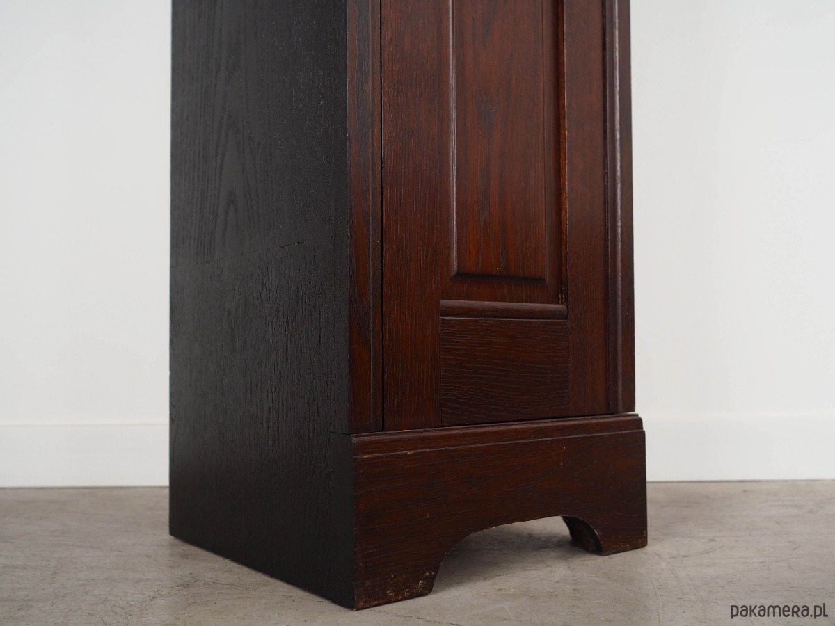 Konstrukcja pokryta jest fornirem dębowym. Powierzchnia po odświeżeniu. Wewnątrz przestrzeń została wypełniona czterema praktycznymi półkami bez możliwości regulacji. Mebel z klasycznym rozwiązaniem drzwi otwieranych, dzięki czemu mamy swobodny dostęp do jego wnętrza. Klucz w zestawie.