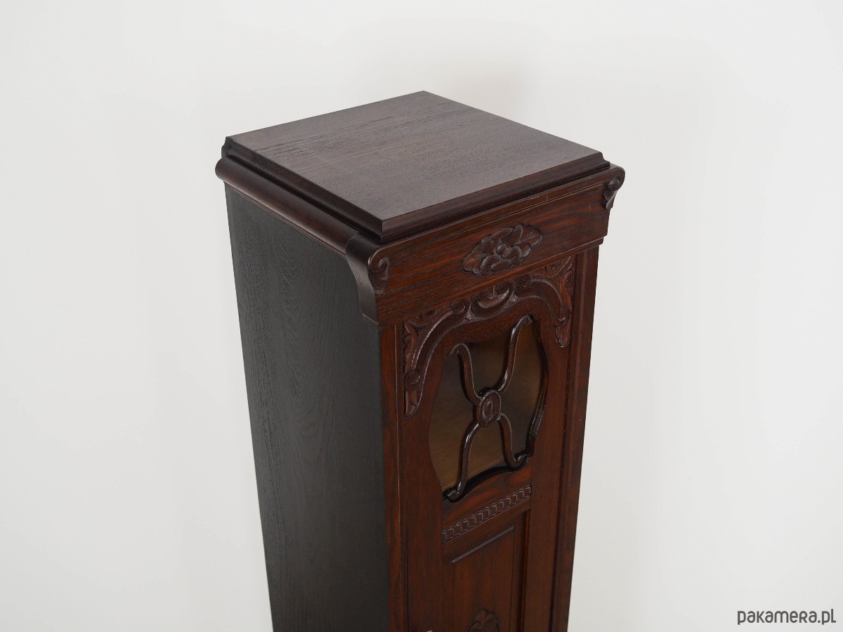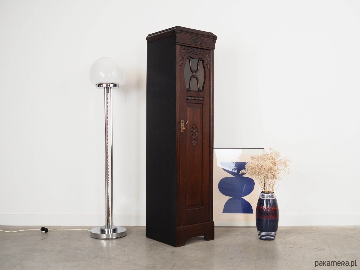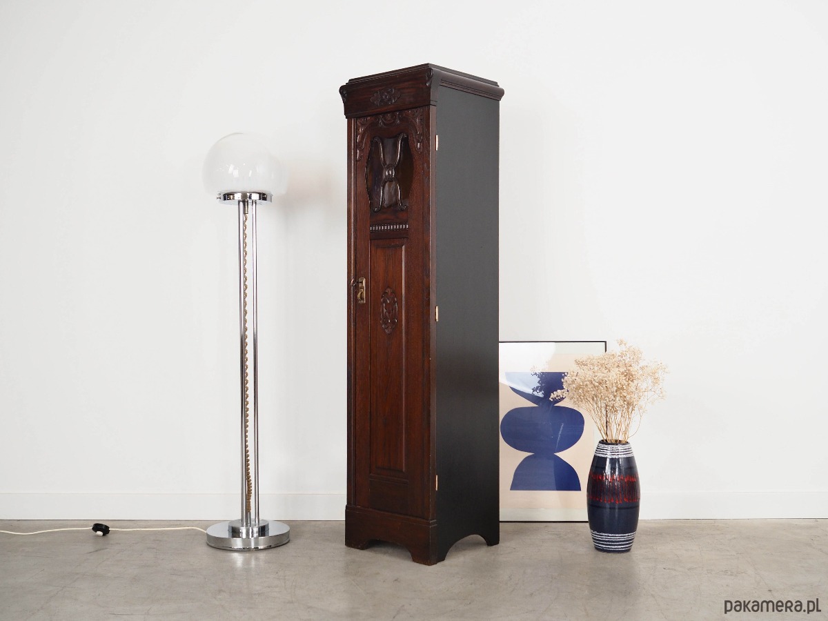 Konstrukcja pokryta jest fornirem dębowym. Powierzchnia po odświeżeniu. Wewnątrz przestrzeń została wypełniona czterema praktycznymi półkami bez możliwości regulacji. Mebel z klasycznym rozwiązaniem drzwi otwieranych, dzięki czemu mamy swobodny dostęp do jego wnętrza. Klucz w zestawie.