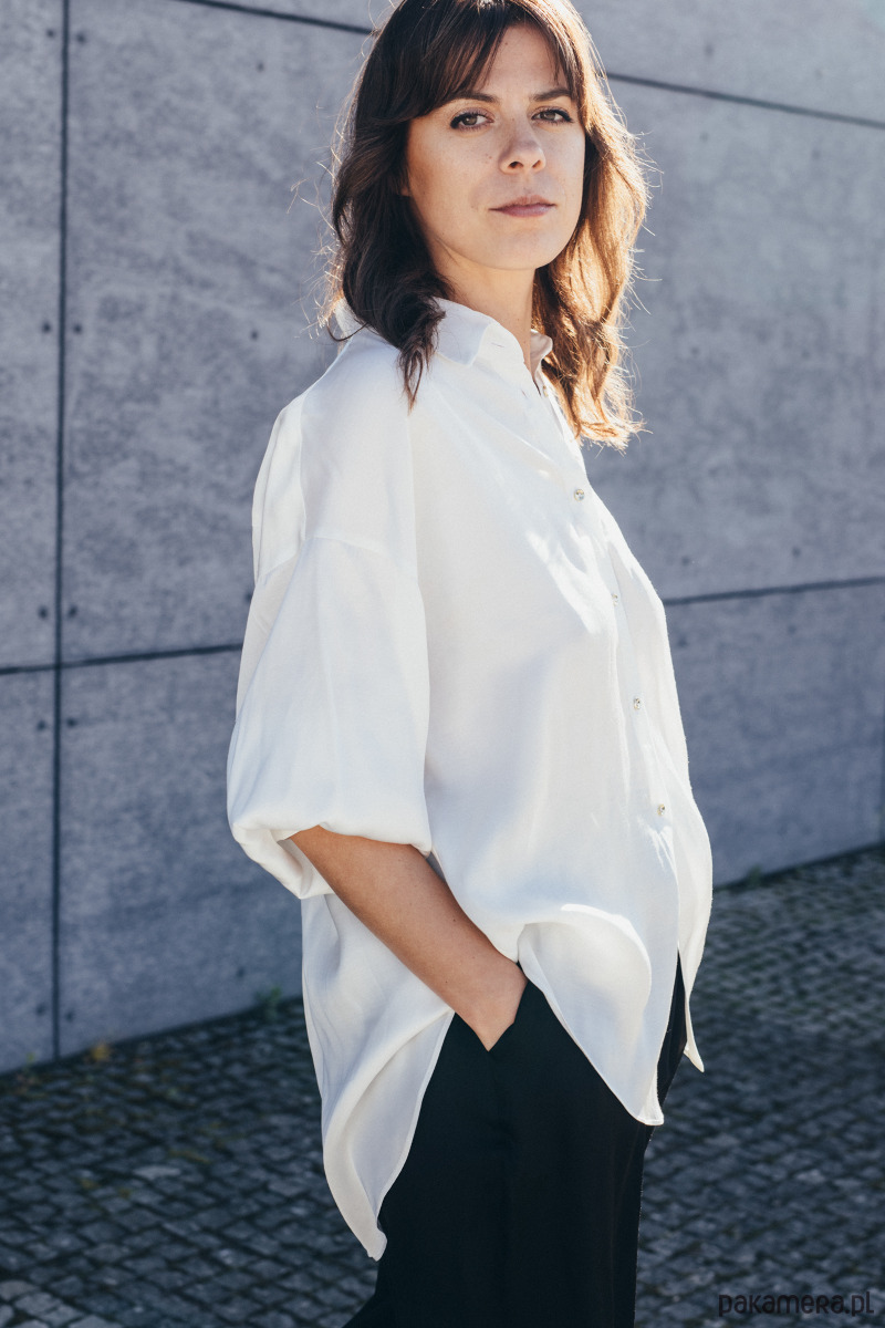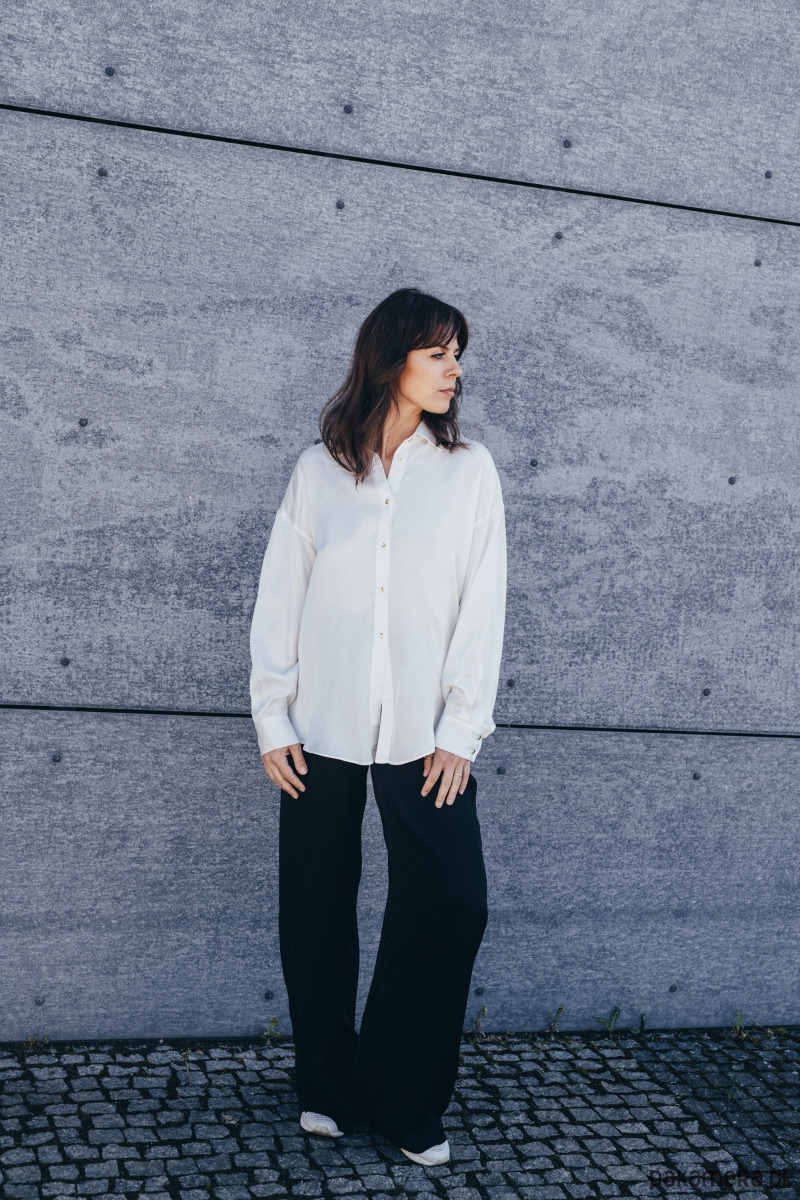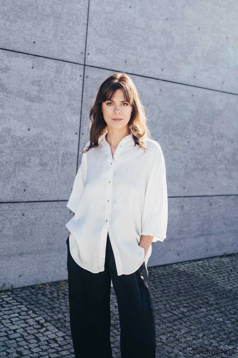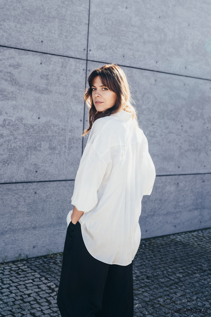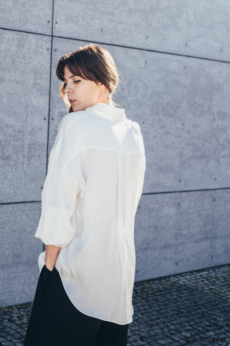W tej kremowej koszuli z satyny jest zaklęta intymność. Oversize’owy fason otula swobodnie ciało, a miękka satyna delikatnie odbija światło. Klasyczny kołnierzyk, szerokie rękawy z mankietami i eleganckie guziki sprawiają, że możesz ją nosić zarówno nonszalancko rozpiętą, jak i zapiętą na ostatni guzik.