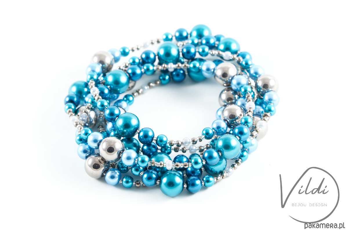 Metrowiec wykonany z linki jubilerskiej, elementów posrebrzanych, szklanych koralików i perełek. Obwód korali to ok 153cm! Posiada zapięcie.