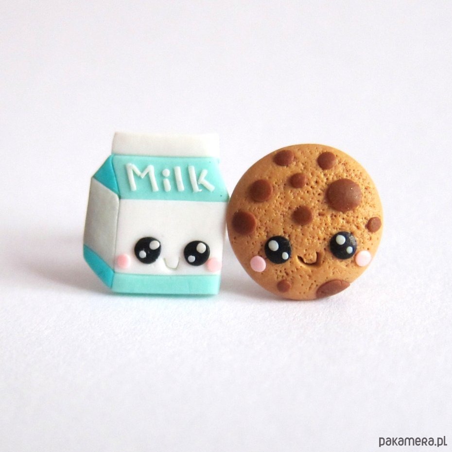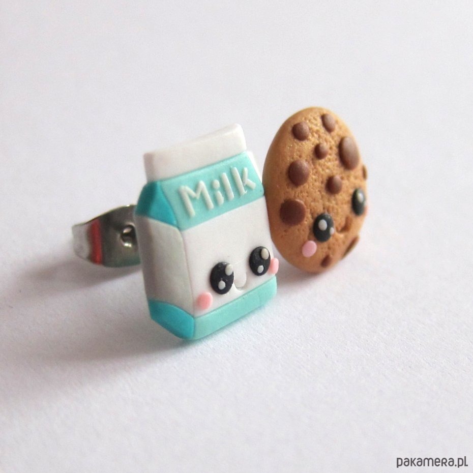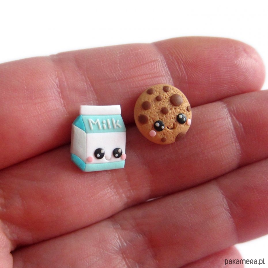 Zabawne kolorowe kolczyki wykonane ręcznie z masy termoutwardzalnej Fimo w kształcie mleka i ciasteczka. Wielkość kolczyków to ok. 1,2 cm. Sztyfty wykonane są ze stali chirurgicznej. Kolczyki świetne na prezent