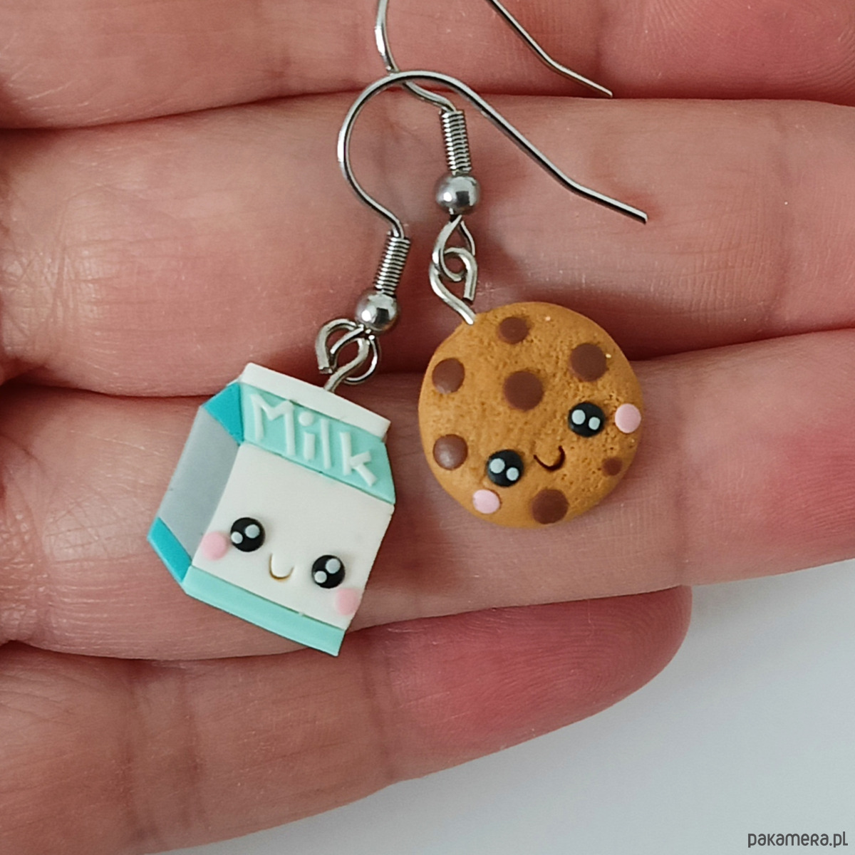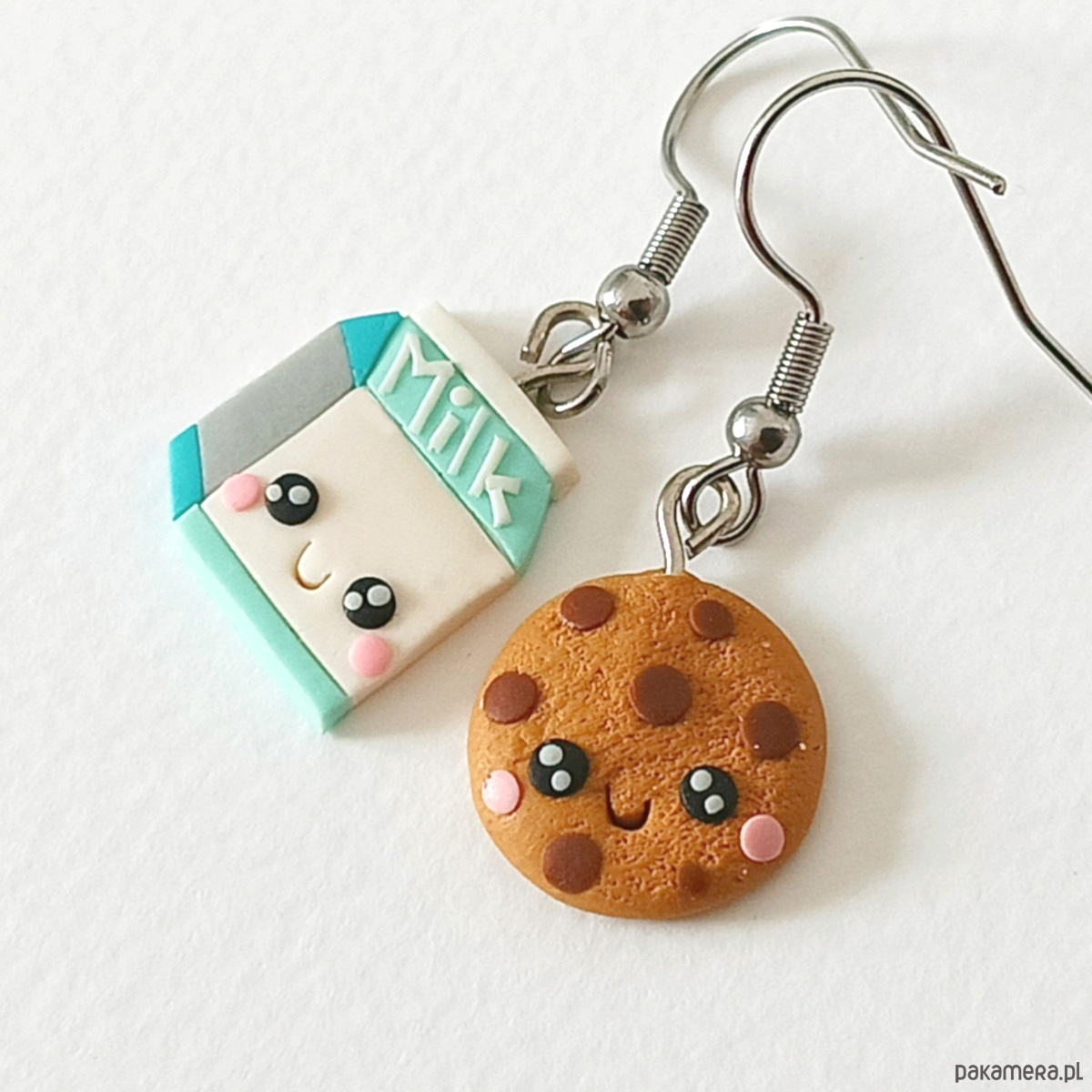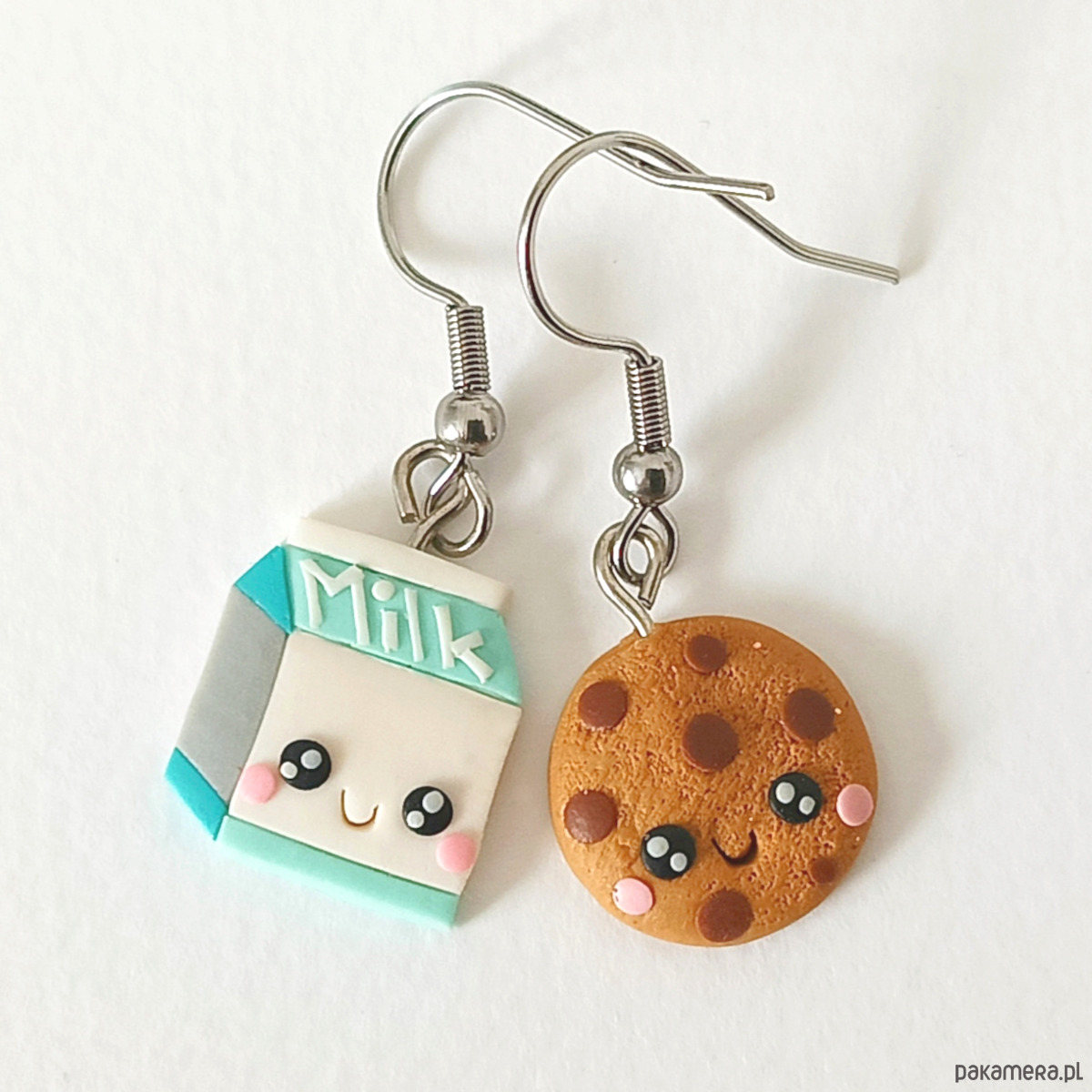 Zabawne, kolorowe kolczyki wykonane ręcznie z masy termoutwardzalnej Fimo w kształcie mleka i ciasteczka. To uroczy i nietuzinkowy dodatek, który przyciąga uwagę i dodaje stylizacji odrobiny humoru oraz słodkiego charakteru.