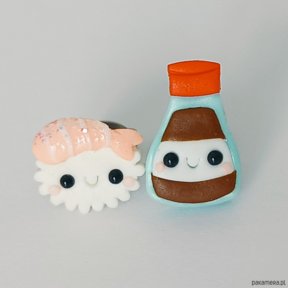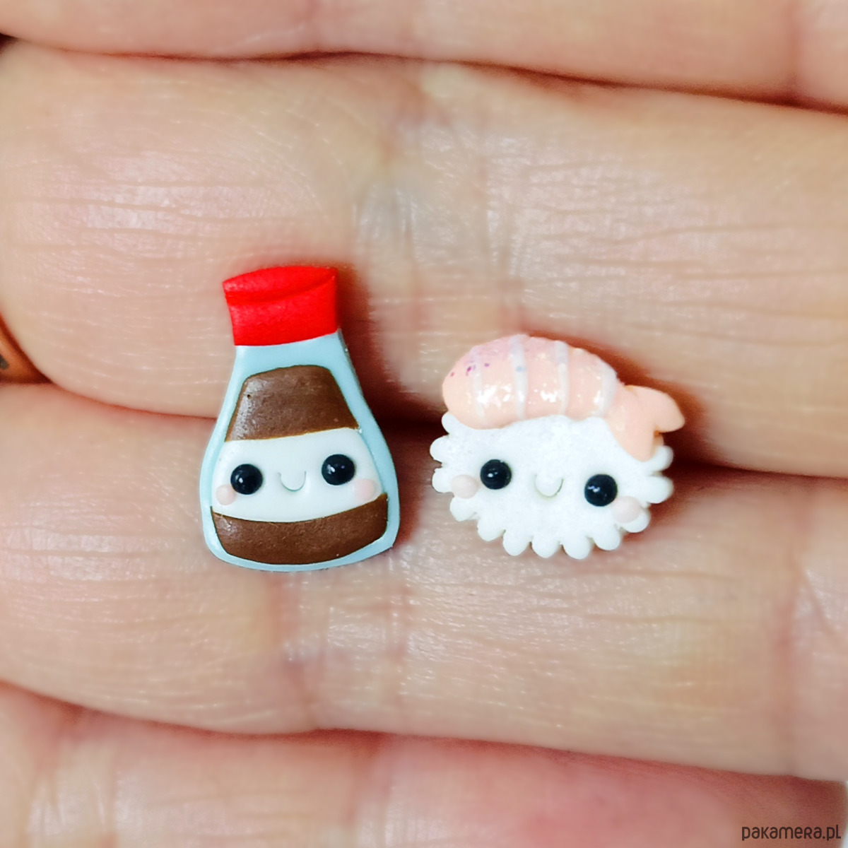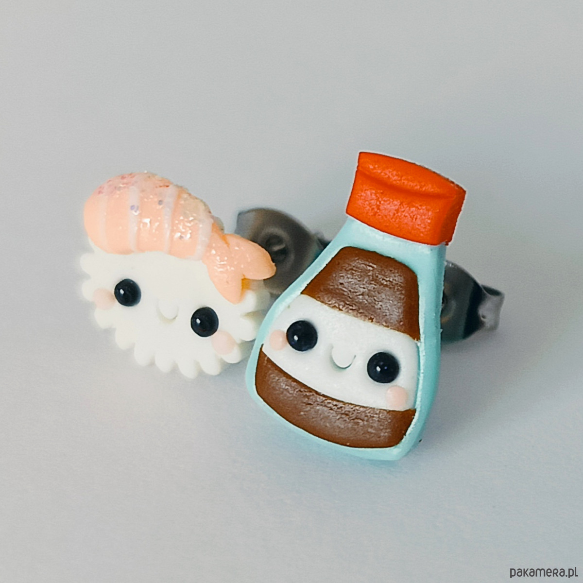Urocze i nietuzinkowe kolczyki wykonane ręcznie z wysokiej jakości masy termoutwardzalnej Fimo w kształcie sushi oraz buteleczki sosu sojowego. To wyjątkowy dodatek dla osób, które lubią oryginalną biżuterię z przymrużeniem oka i odrobiną humoru