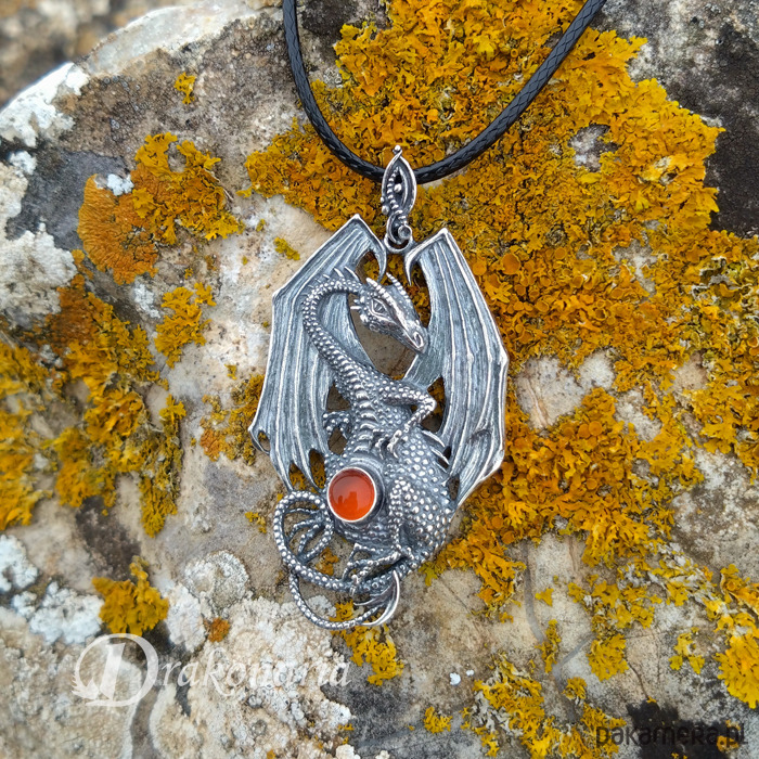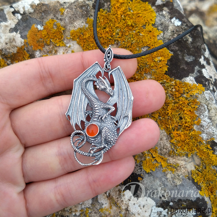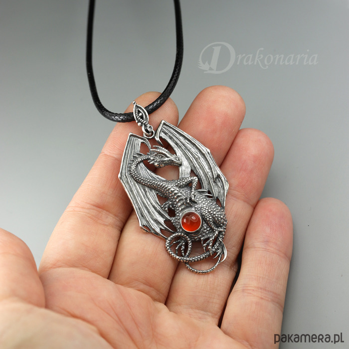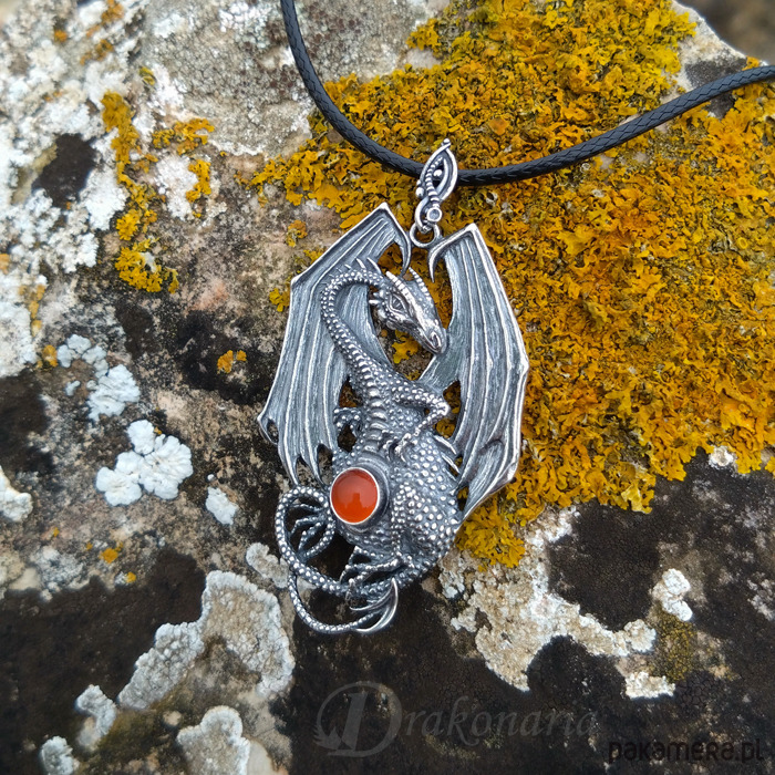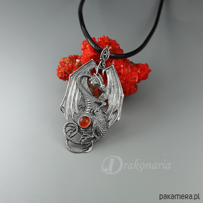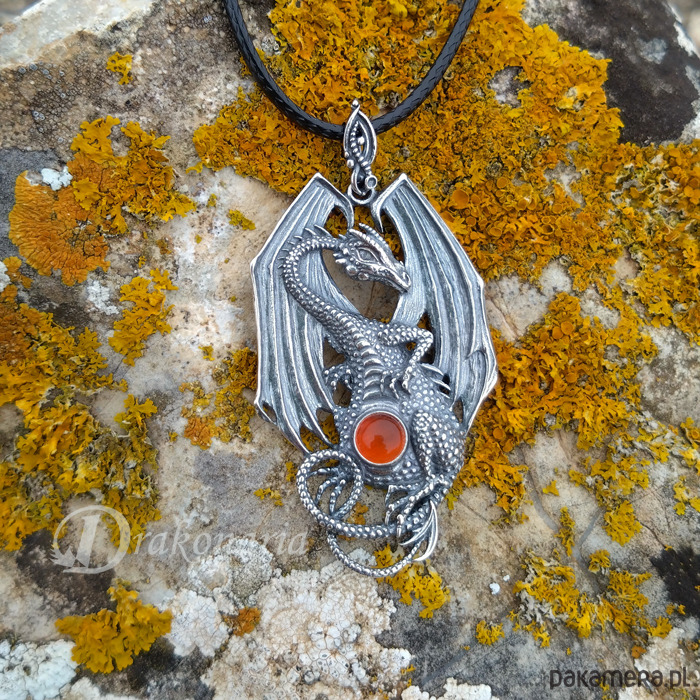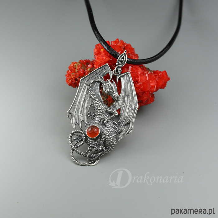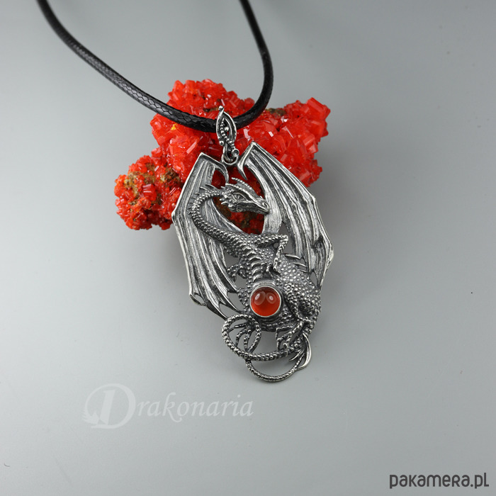 Niezwykły, ażurowy wisior, pełen zadziwiających detali, zaprojektowany przeze mnie od podstaw ręcznie, wykonany ze srebra pr. 925, zdobiony ognistym karneolem (5.5 mm). Stanowi część mojej kolekcji symboli, celebrujących mity, dawne opowieści i folklor. Wisiorek przedstawia rzeźbionego smoka, strzegącego niezwykłego skarbu.