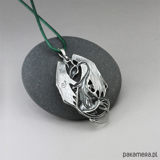 Smoki pojawiają się w legendach całego świata, jako potężne, budzące respekt i podziw istoty, często pilnujące skarbów lub zadziwiających sekretów. Czasami przedstawiane są jako przewrotne i podstępne, a nierzadko bardzo inteligentne. Smok, ze względu na swoje różnorodne przedstawienia może być bardzo złożonym symbolem. Dla mnie stanowi przede wszystkim opowieść o sile, szeroko rozumianych ukrytych skarbach i wewnętrznym ogniu, który być może jeszcze musimy odnaleźć, rozniecić na nowo, czy też podtrzymać. Z tyłu wisiorka, w brzuchu smoka znajduje się właśnie taki, symboliczny płomień. Każdy detal tej pracy - smocza głowa, faktura skóry, pazury, skrzydła -zostały wyrzeźbione przeze mnie ręcznie. Wisior oksydowany i polerowany o nieco mrocznym i tajemniczym charakterze.