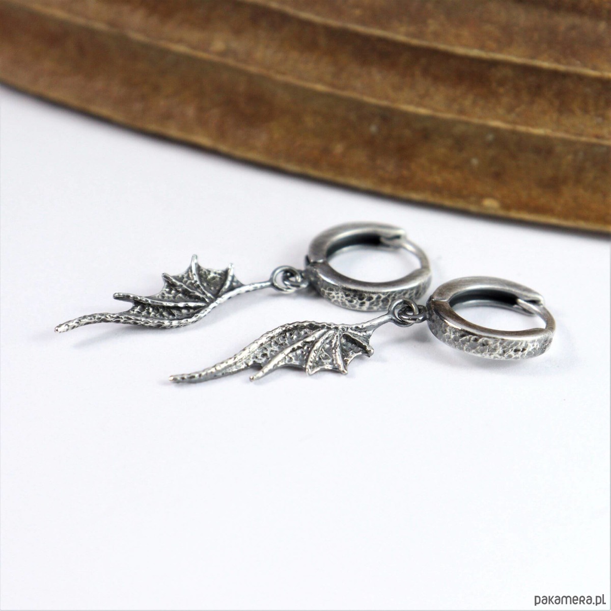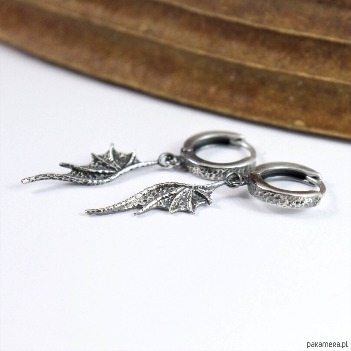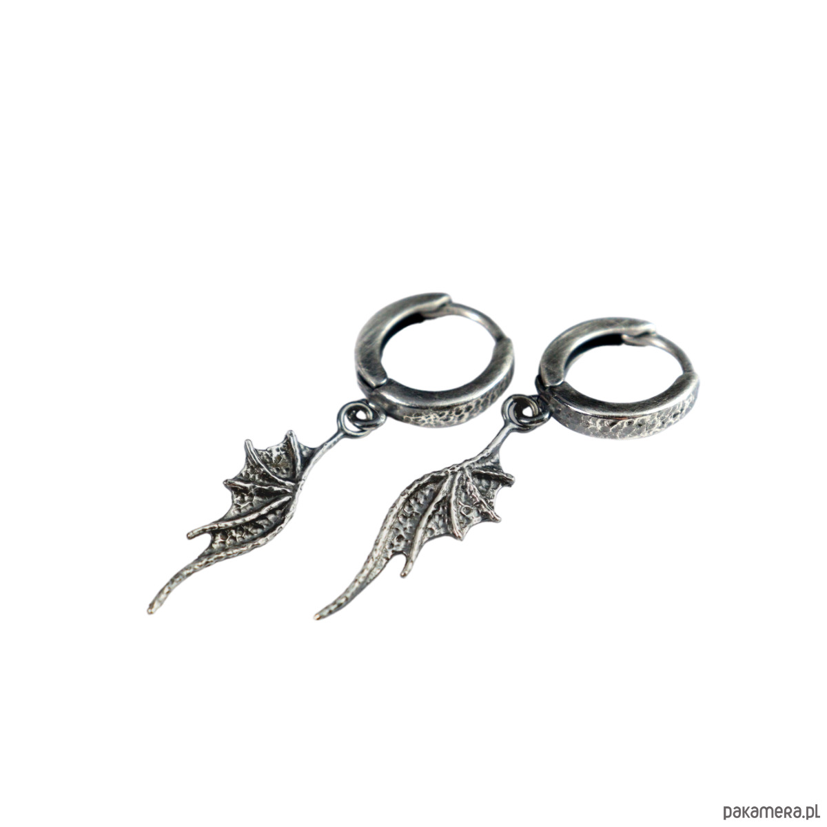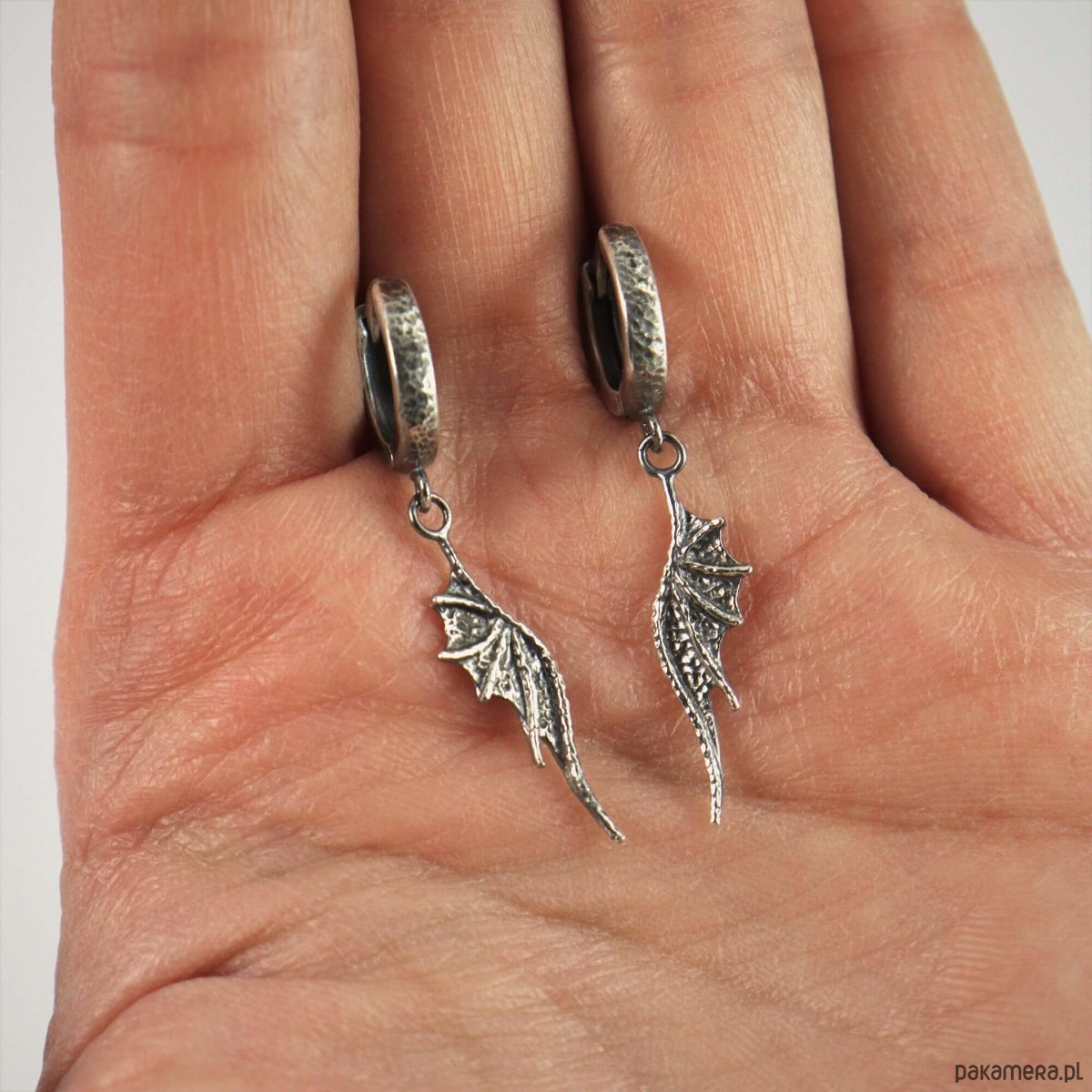 Małe kolczyki wiszące na ozdobnych biglach, w kształcie smoczych skrzydeł. Komplet kolczyków o surowej stylistyce, stworzony z myślą o kobietach, które poszukują w biżuterii "pazura", jednocześnie nie tracąc na subtelności wyrazu. Oryginalna biżuteria smocza, która podkreśla osobowość, to świetna opcja na prezent dla fanki literatury fantasy, przykładowo Wiedźmina czy Gry o tron. Każdy najmniejszy element kolczyków został wykonany ręcznie ze srebra pr. 925. Srebro zostało przyciemnione oksydą w celu wydobycia piękna fakturowanej powierzchni.