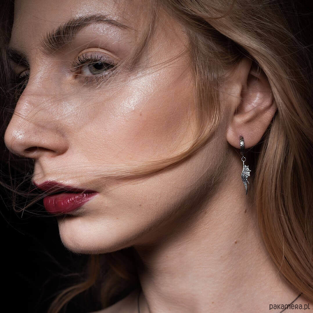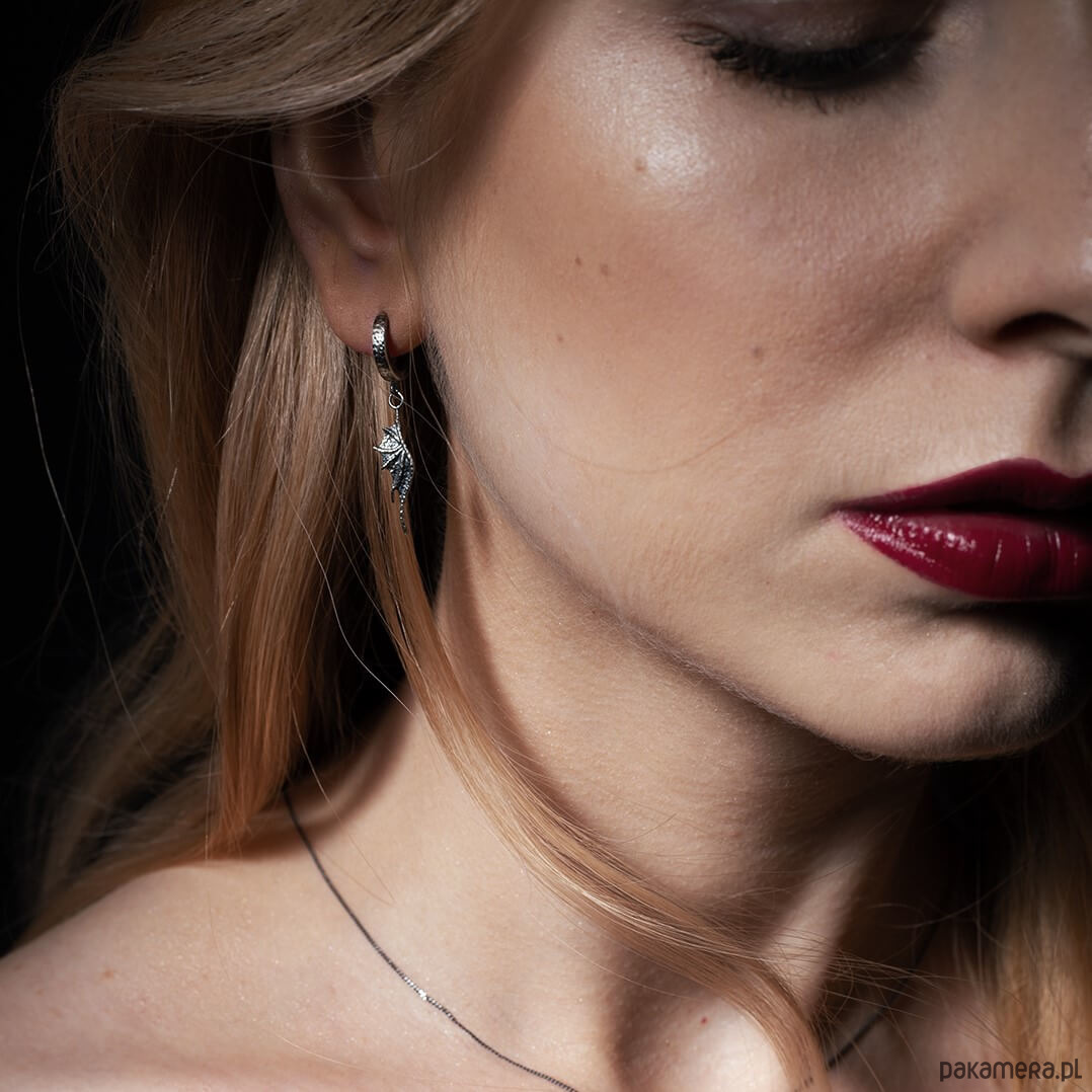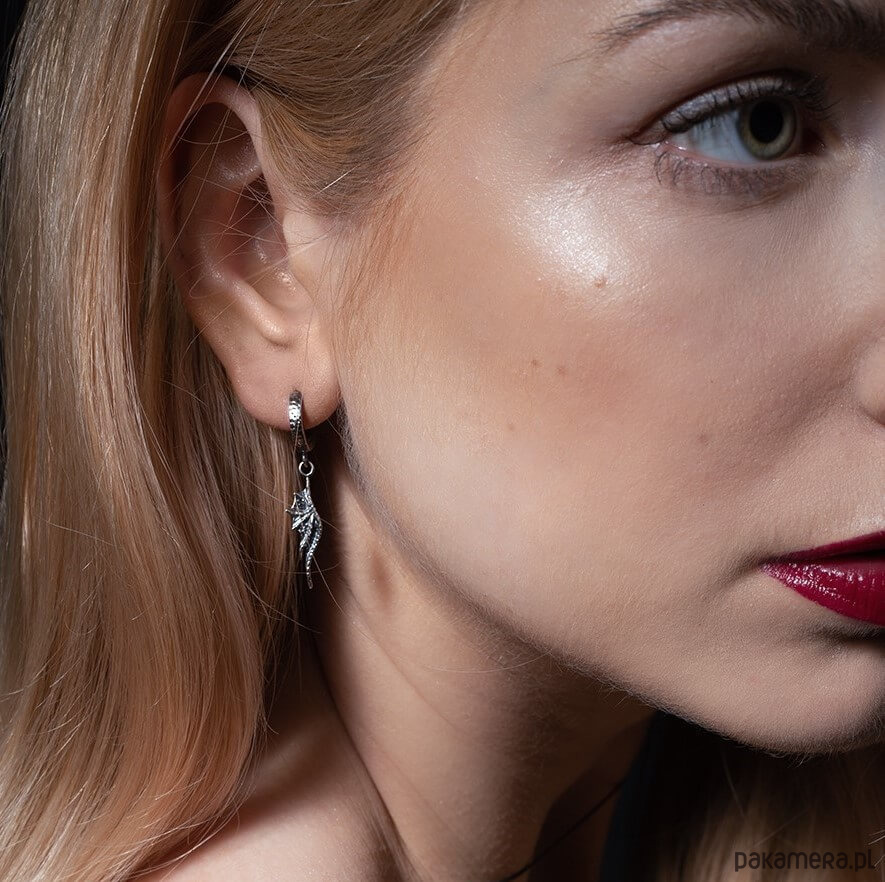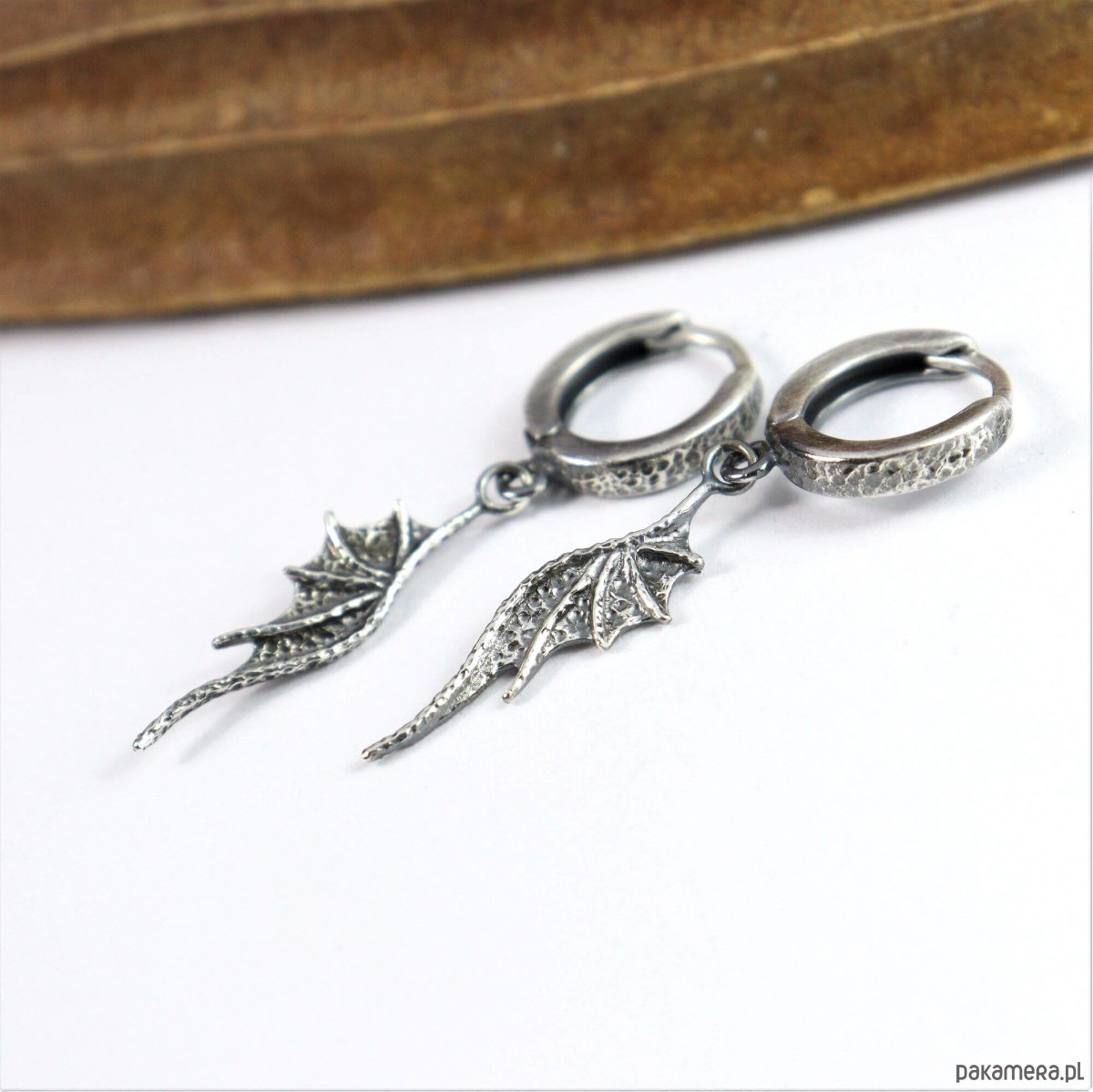 Małe kolczyki wiszące na ozdobnych biglach, w kształcie smoczych skrzydeł. Komplet kolczyków o surowej stylistyce, stworzony z myślą o kobietach, które poszukują w biżuterii "pazura", jednocześnie nie tracąc na subtelności wyrazu. Oryginalna biżuteria smocza, która podkreśla osobowość, to świetna opcja na prezent dla fanki literatury fantasy, przykładowo Wiedźmina czy Gry o tron. Każdy najmniejszy element kolczyków został wykonany ręcznie ze srebra pr. 925. Srebro zostało przyciemnione oksydą w celu wydobycia piękna fakturowanej powierzchni.