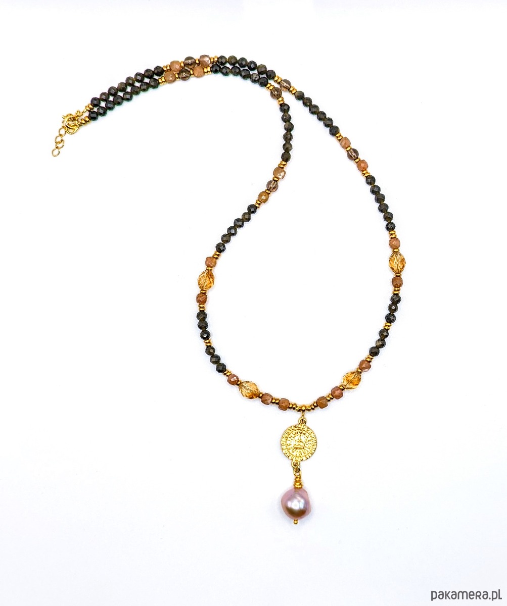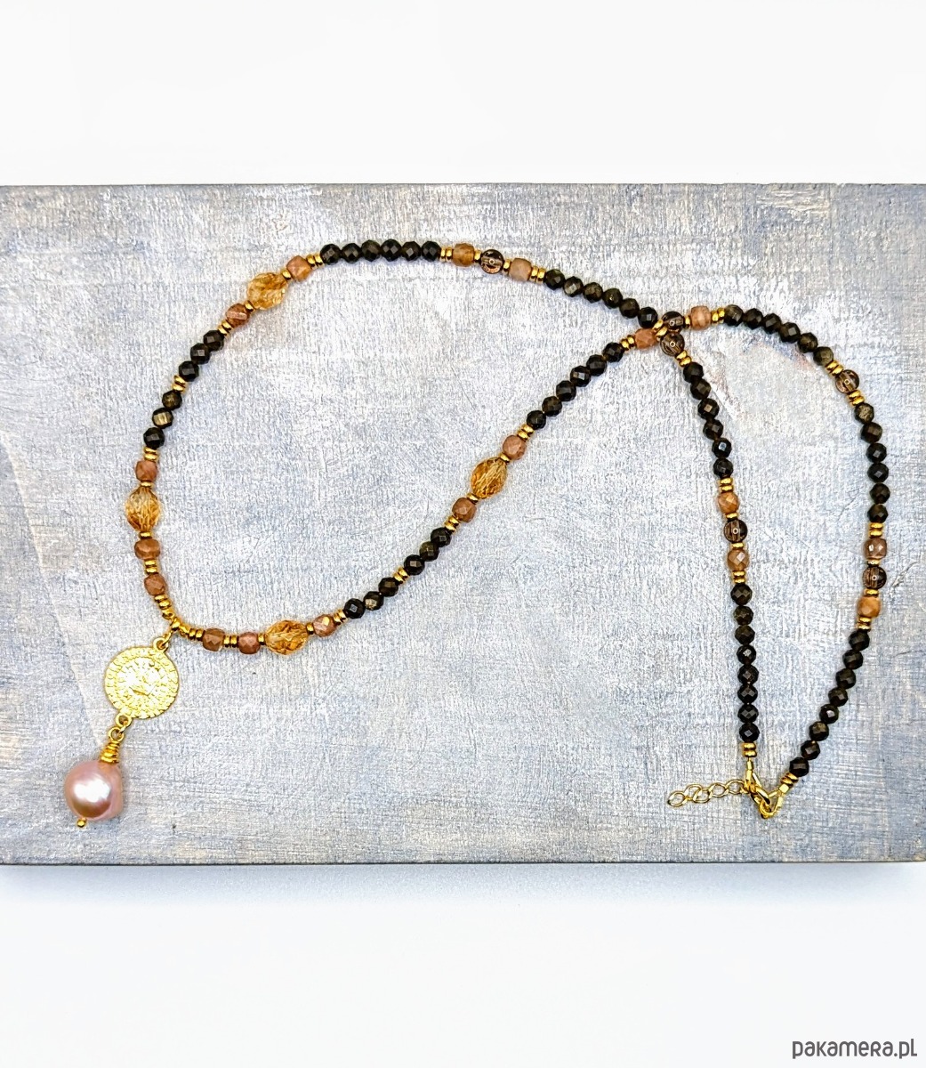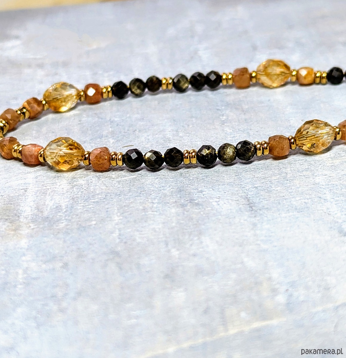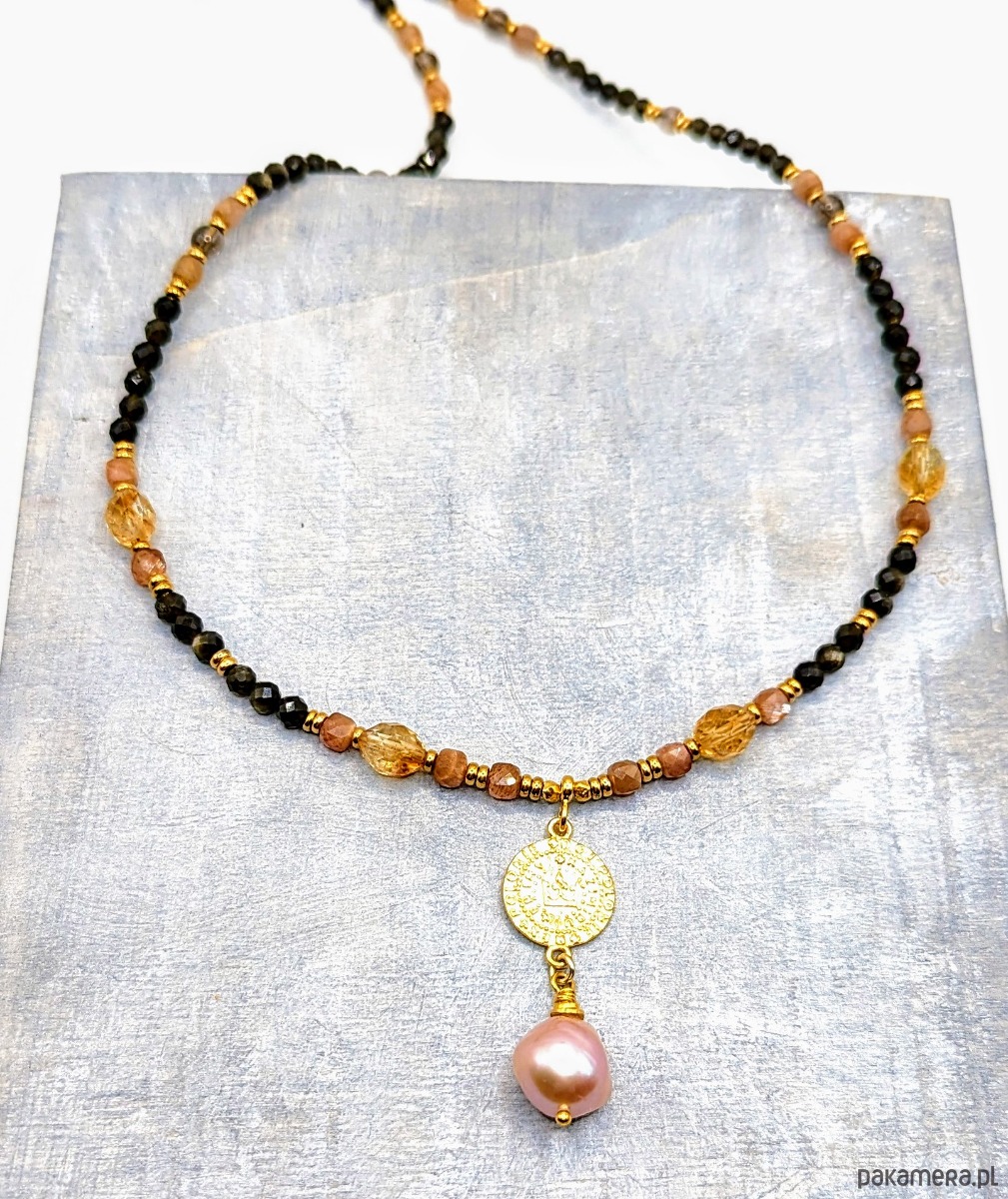 Naszyjnik z kamieni, które emanują "energią mocy". Obsydian i kamień słoneczny opalizują na złoto, co dodatkowo zostało pokreślone pięknie szlifowanym cytrynem. Dla równowagi dodałam kilka kwarców dymnych i tonującą perłę barokową w odcieniu pudrowego różu. Złocona moneta z koroną dopełnia całości.