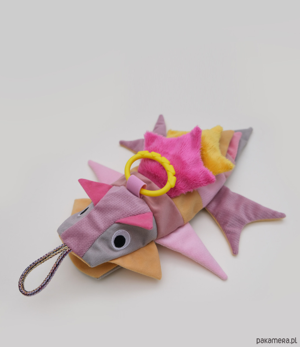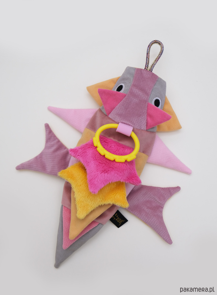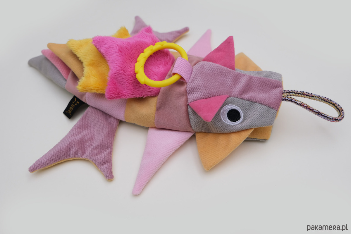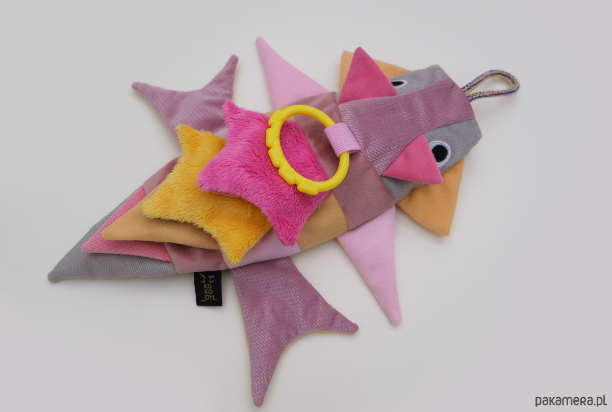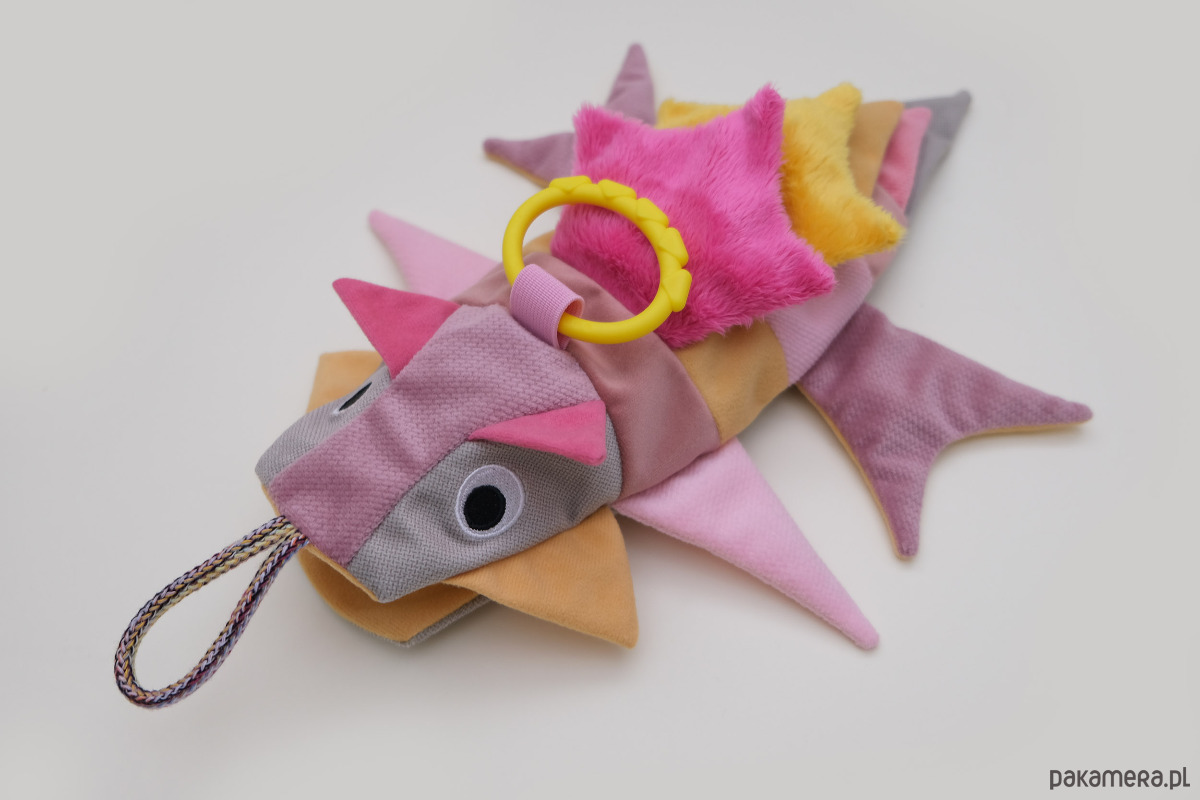 Do zabawki dołączamy plastikowe kółeczko – gryzak, które można przekładać przez kolorowe gumki znajdujące się w zabawce. W ten sposób dziecko ćwiczy precyzyjne ruchy dłoni.