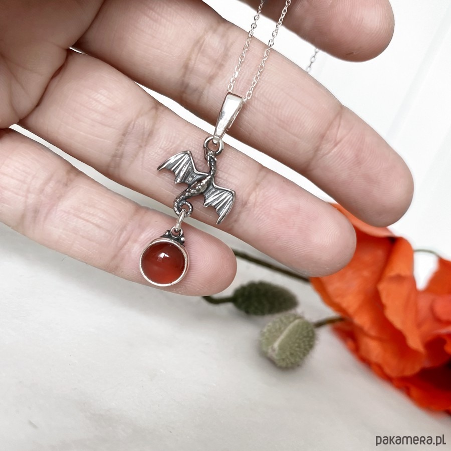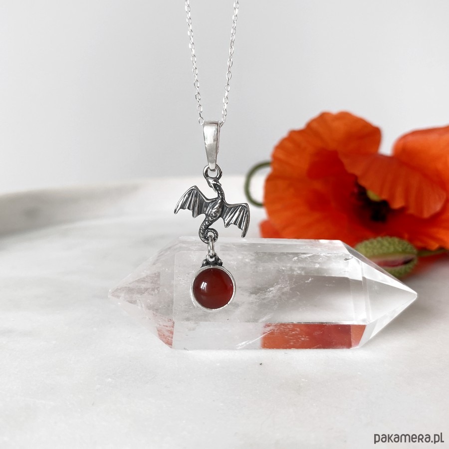 Niezwykły, delikatny wisiorek z motywem smoka ozdobiony naturalnym karneolem.