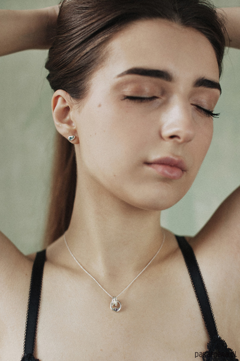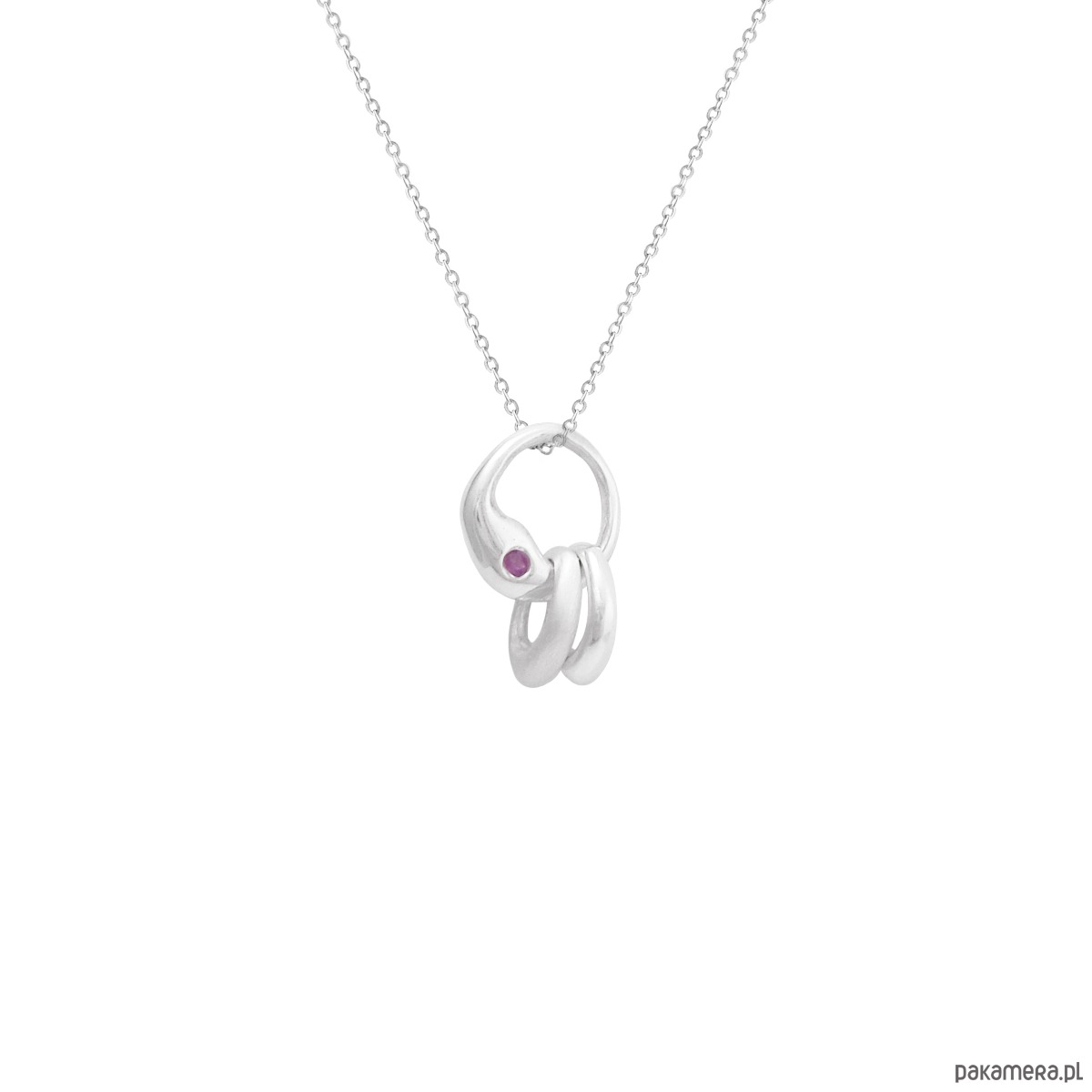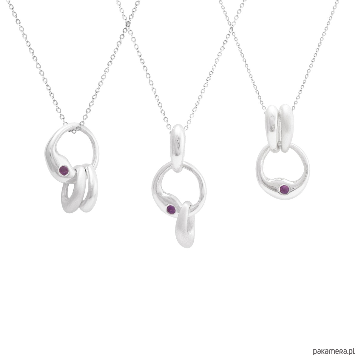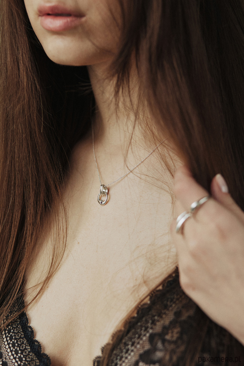 SMOOTH gemstones long to niezwykły naszyjnik wykonany ze srebra próby 925. Charakteryzuje się organiczną gładką, asymetryczną formą. Naszyjnik składa się z trzech połączonych ze sobą nieregularnych kółek. Są one połączone luźno ze sobą co daje możliwość modyfikacji formy. W głównej części naszyjnika oprawiony jest kamień szlachetny o średnicy Ø2 mm