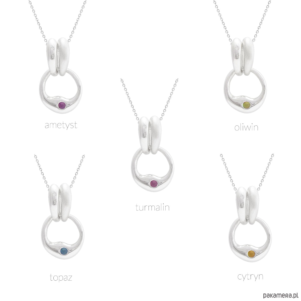 Kamień jest wtopiony w formę i zakuty na gładko. Naszyjnik ma możliwość modyfikacji - można zawiesić kółeczka na różne sposoby, przeplatając łańcuszek przez inne części naszyjnika.