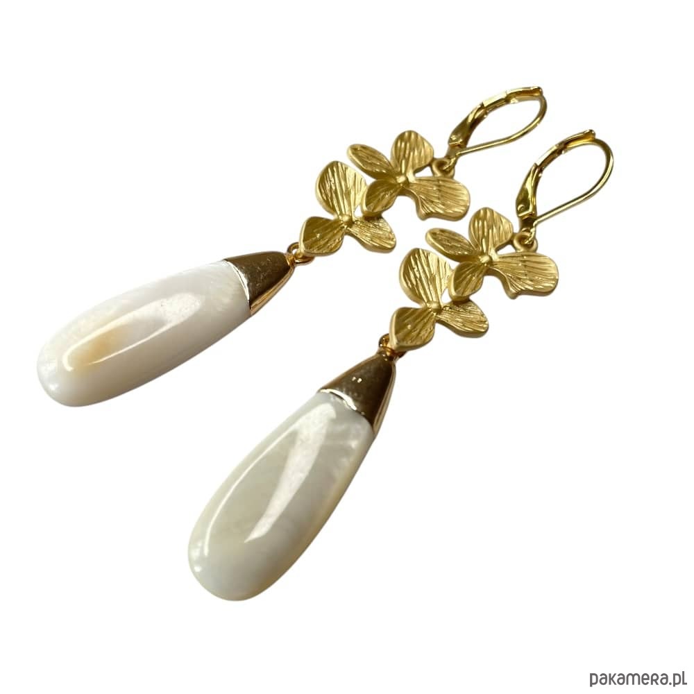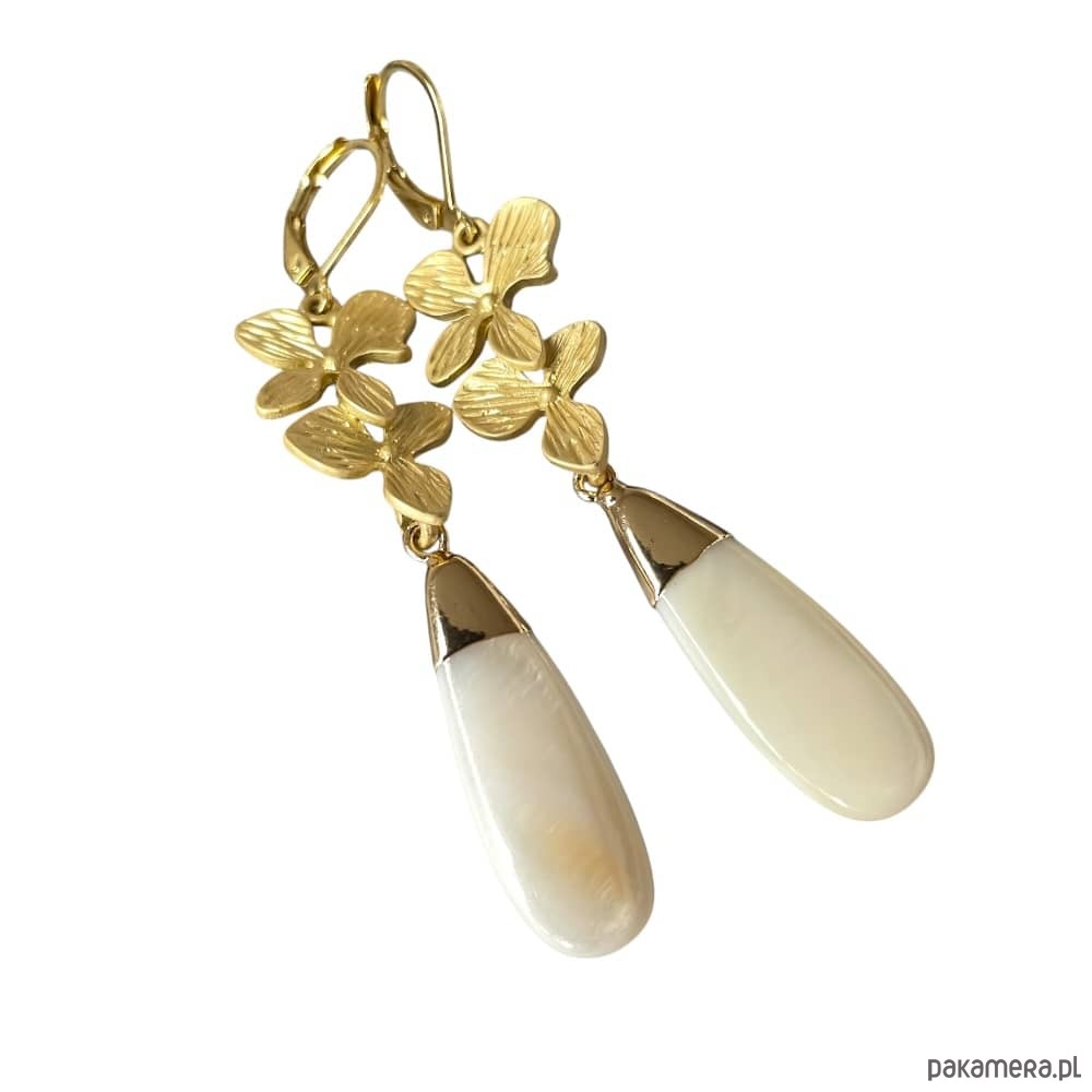 Materiał: stal chirurgiczna pozłacana, masa perłowa w okuciu, kwiatek – metal w kolorze satynowego złota