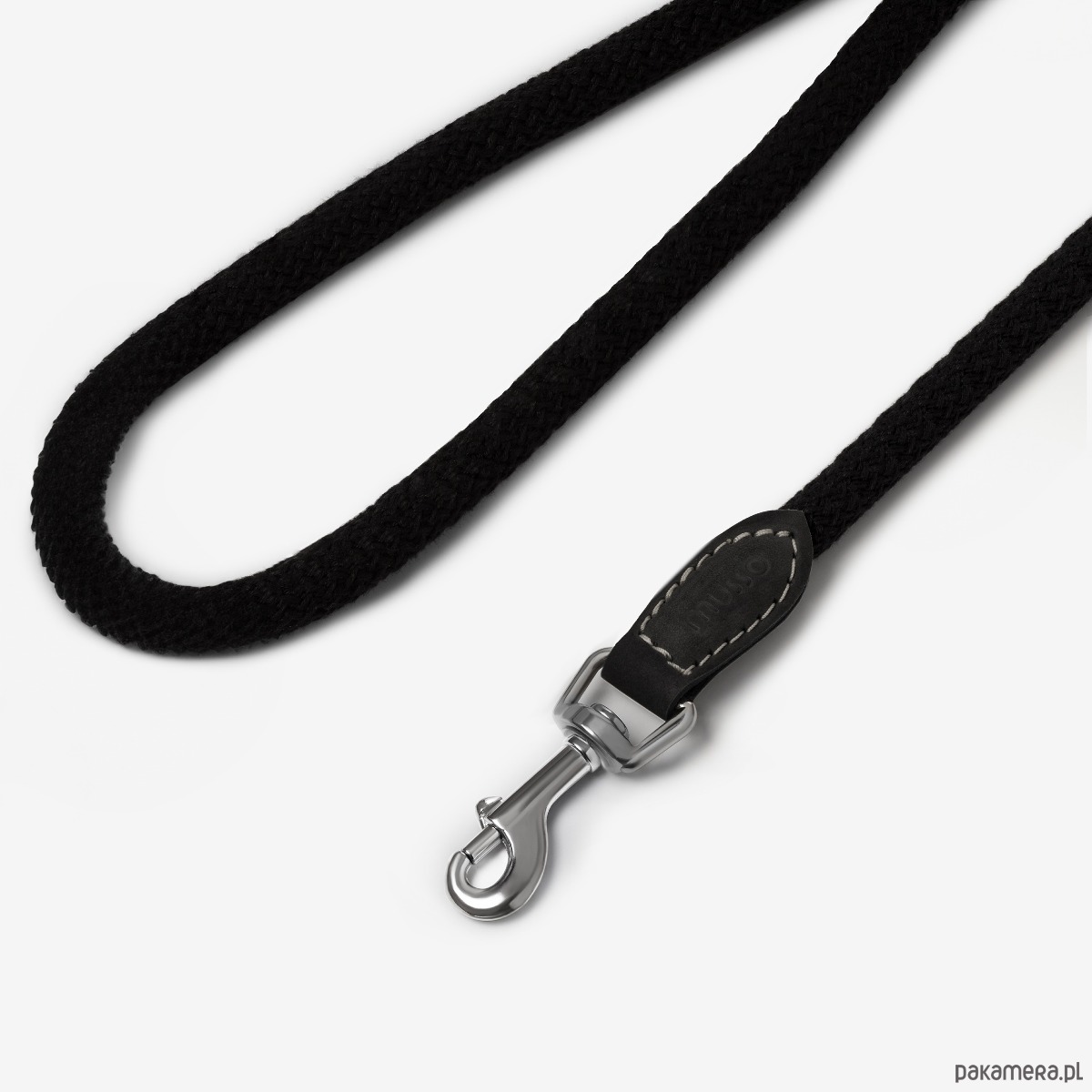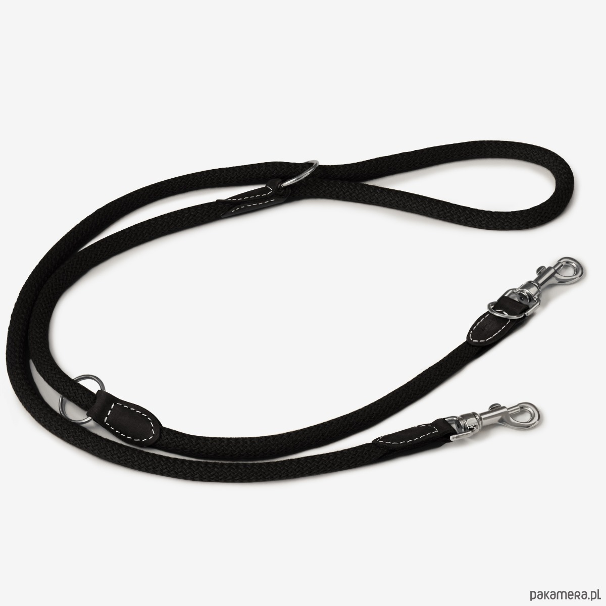 Smycz Corda Multi Nero to wszechstronny model wykonany z grubego, bawełnianego sznura w czarnym kolorze, z detalami z włoskiej, woskowanej skóry naturalnej. Dzięki przemyślanej konstrukcji z dwoma karabińczykami i dwoma pierścieniami, smycz można nosić i wykorzystywać na sześć różnych sposobów: