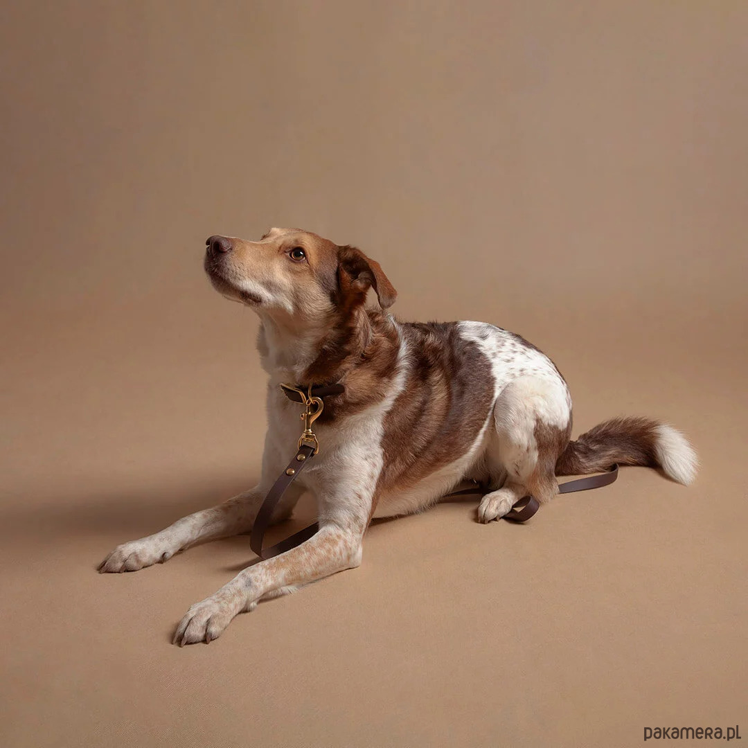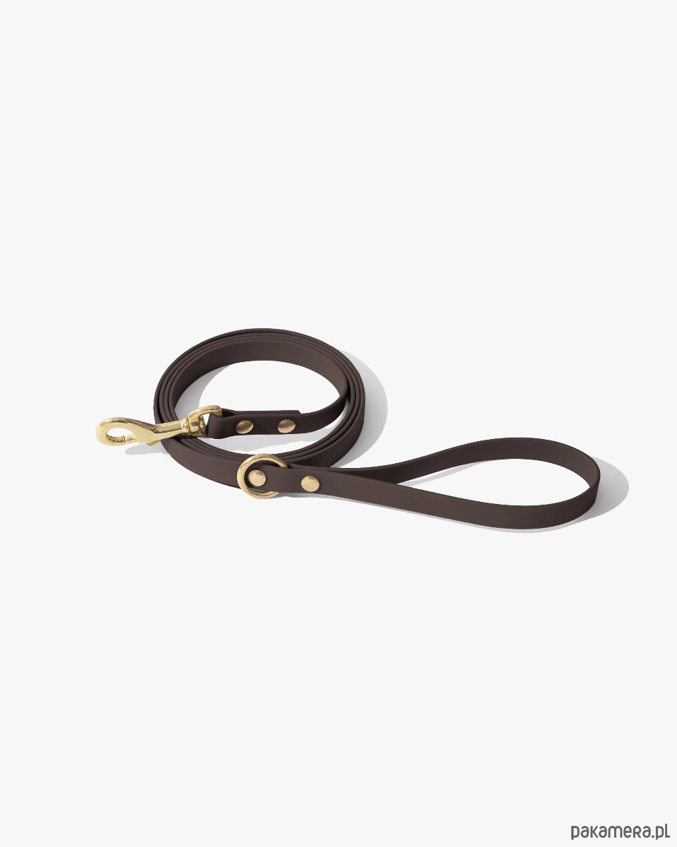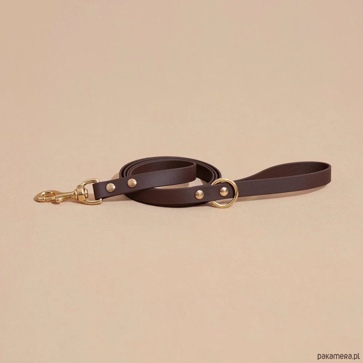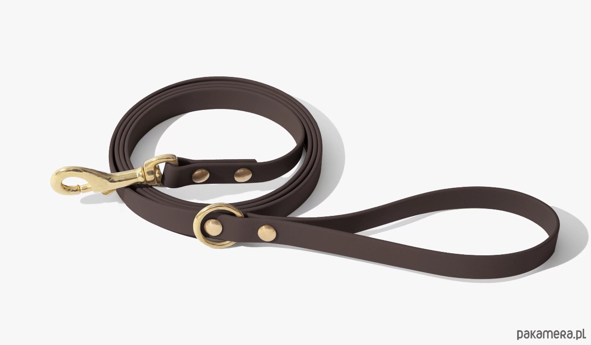 Skład 👀 Taśma: PVC BioThane®; Karabinek, kółko i nity: mosiądz.